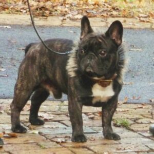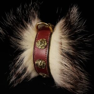 Collier spécial Bouledogue Français en cuir vachette poils de blaireau têtes de lion bronze 3 cm de Large .