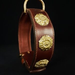 Collier unique en cuir de dosset avec rosace en bronze.