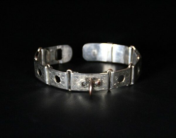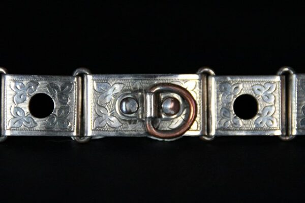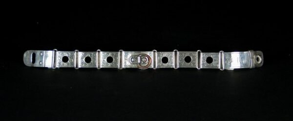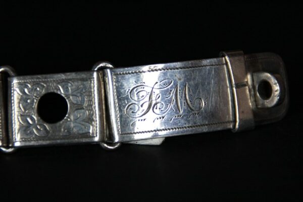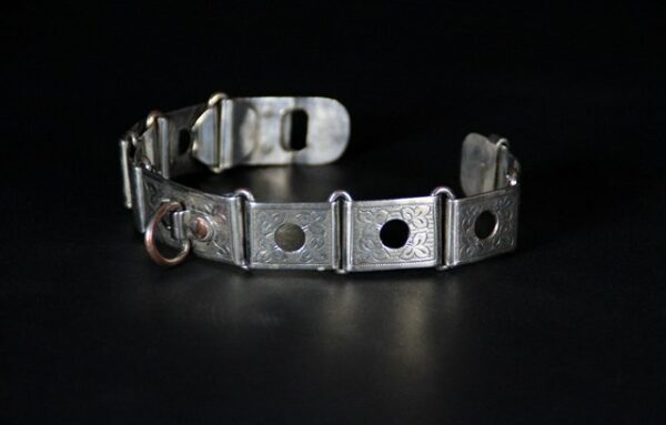 | Magnifique collier pour chien ancien en plaqué argent finement ciselé, en excellent état. Il date environ des années 1850. il est parfaitement fonctionnel. Gravé initiale: F.M dimensions: Largeur: 2 cm longueur totale: 28 cm Idéal pour un tour de cou de 26 cm |