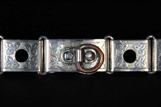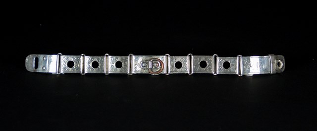 | Magnifique collier pour chien ancien en plaqué argent finement ciselé, en excellent état. Il date environ des années 1850. il est parfaitement fonctionnel. Gravé initiale: F.M dimensions: Largeur: 2 cm longueur totale: 28 cm Idéal pour un tour de cou de 26 cm |