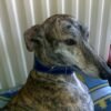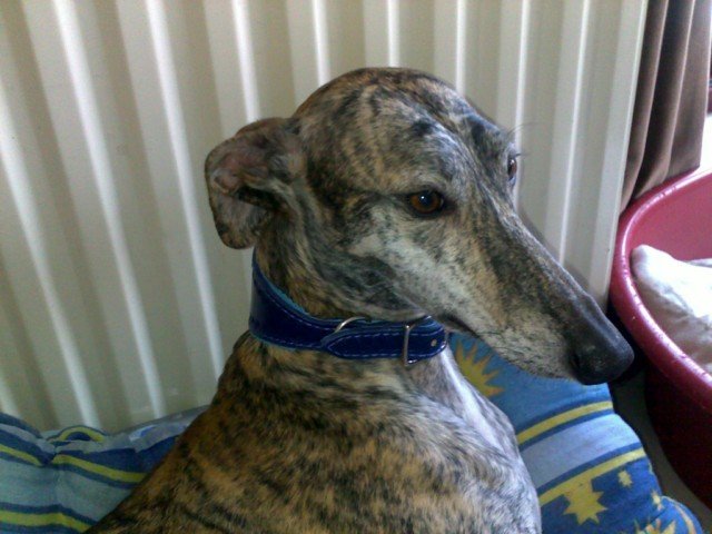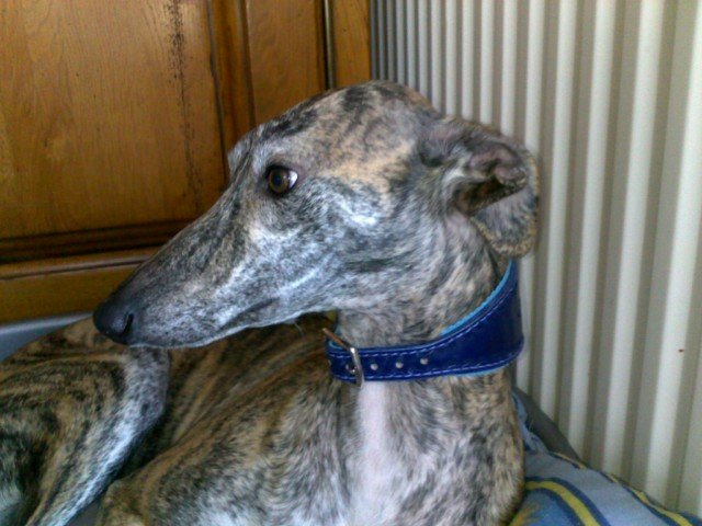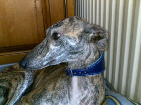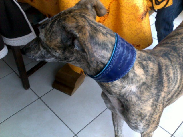 | Berny est un jolie Galgo, portant un collier pour grand lévrier en cuir et avec une doublure agneau. |