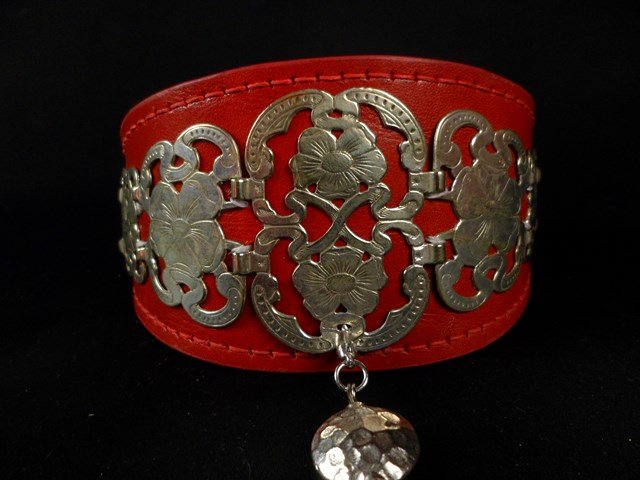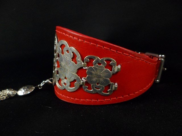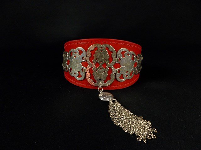 Collier en cuir vachette rouge décors plaqué argent et pompon argenté