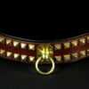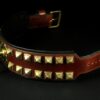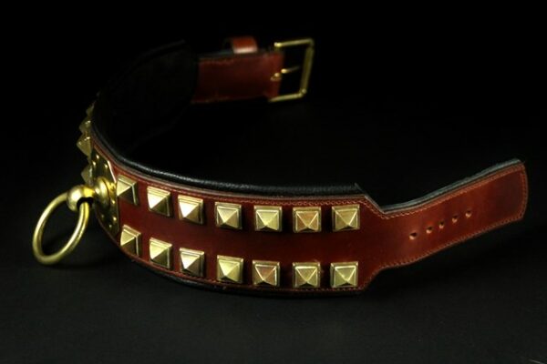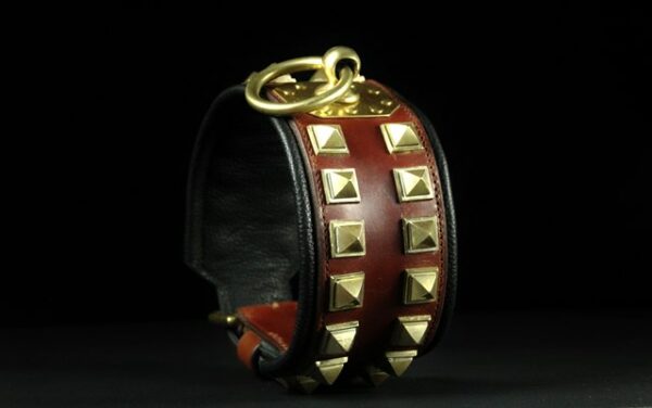 Réalisé à la main, ce collier se compose d’un cuir de dosset marron clair sur le dessus et d’une doublure en cuir de vachette noir pour plus de confort et de résistance. Sa largeur exceptionnelle de 8 cm (9,5 cm avec bordure) en fait un modèle rare et imposant, parfaitement adapté aux chiens puissants.