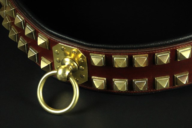Réalisé à la main, ce collier se compose d’un cuir de dosset marron clair sur le dessus et d’une doublure en cuir de vachette noir pour plus de confort et de résistance. Sa largeur exceptionnelle de 8 cm (9,5 cm avec bordure) en fait un modèle rare et imposant, parfaitement adapté aux chiens puissants.