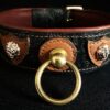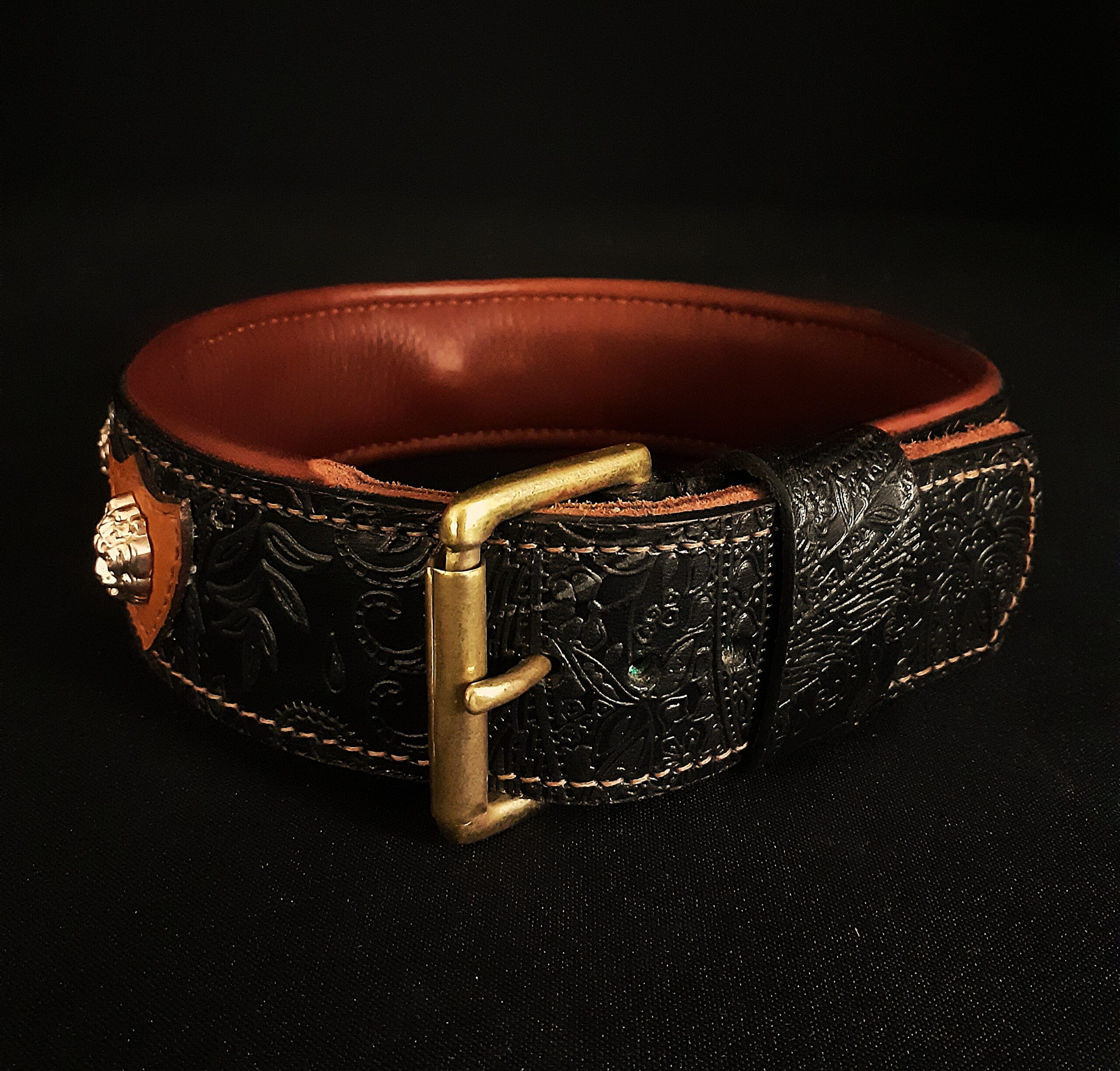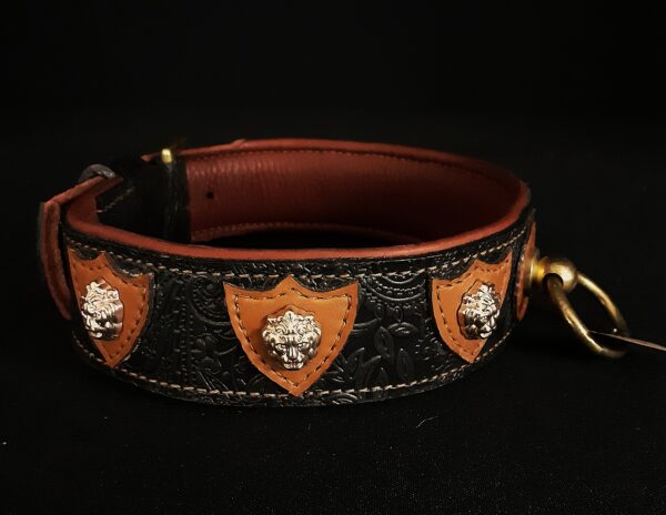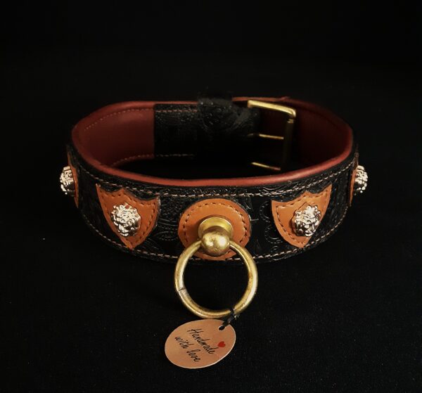 Offrez un collier de caractère à votre compagnon avec notre modèle « Cachemire », un collier pour chien artisanal en cuir de vachette noir, orné de têtes de lions décoratives pour un style puissant et raffiné.