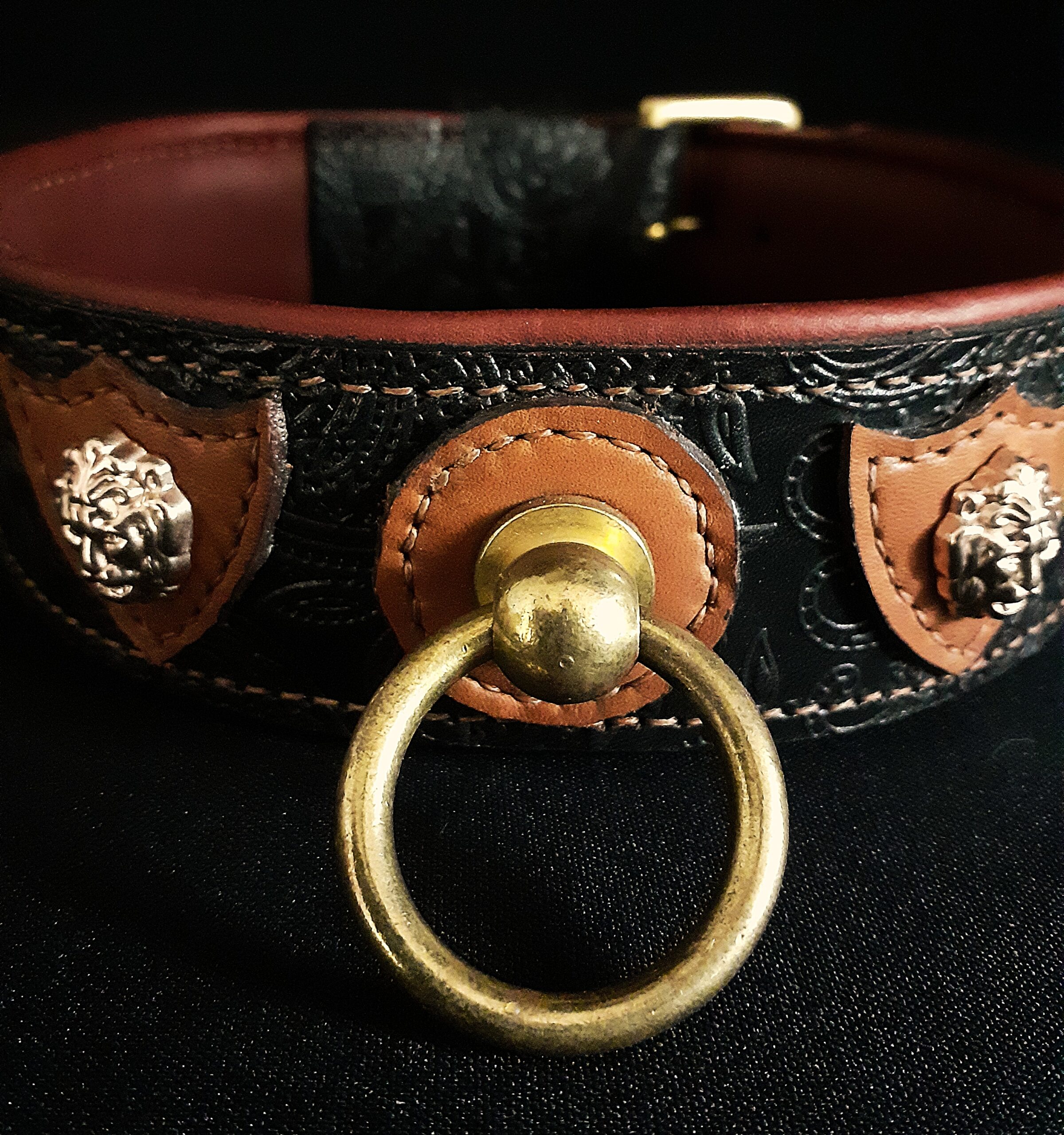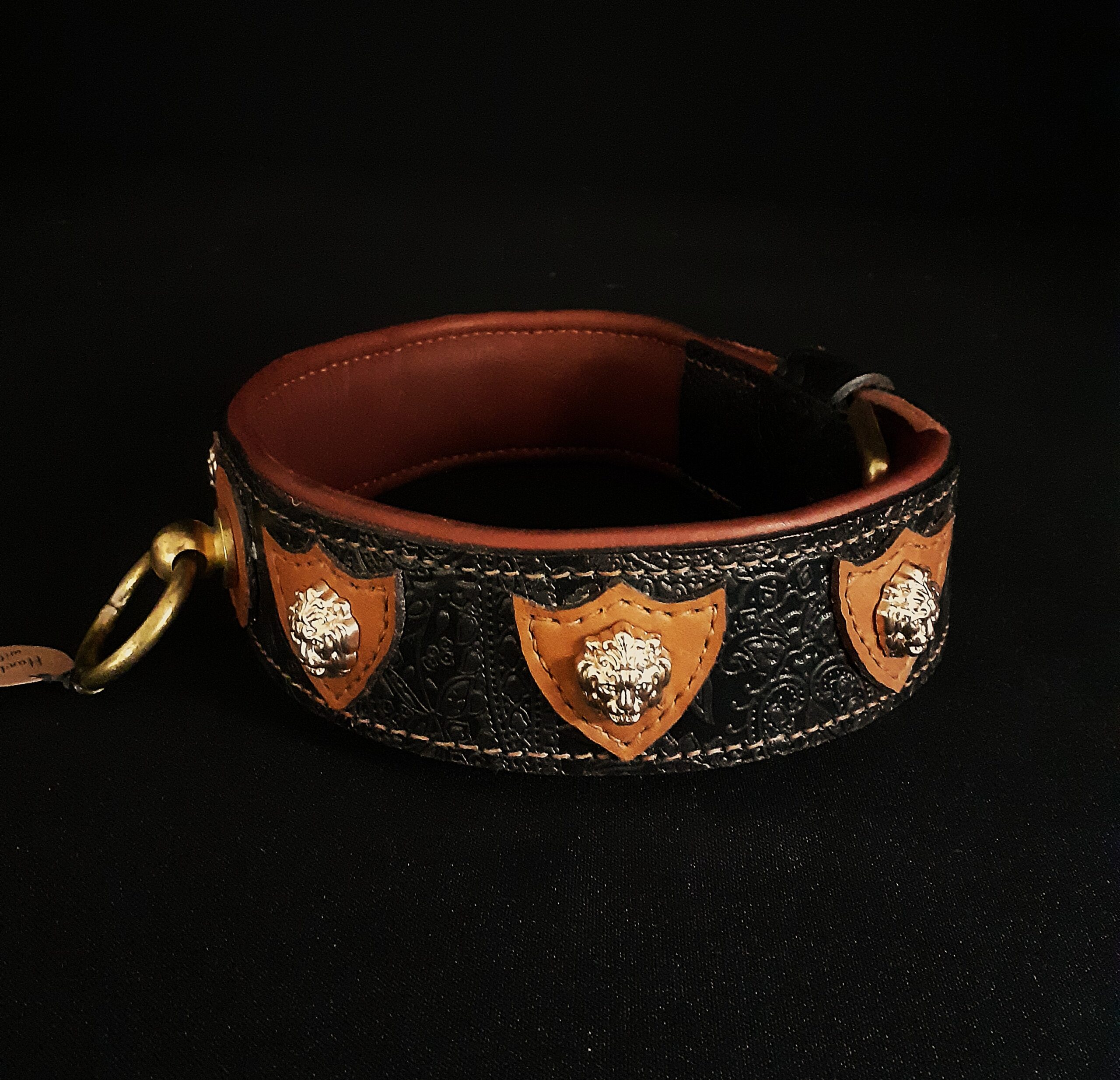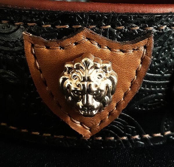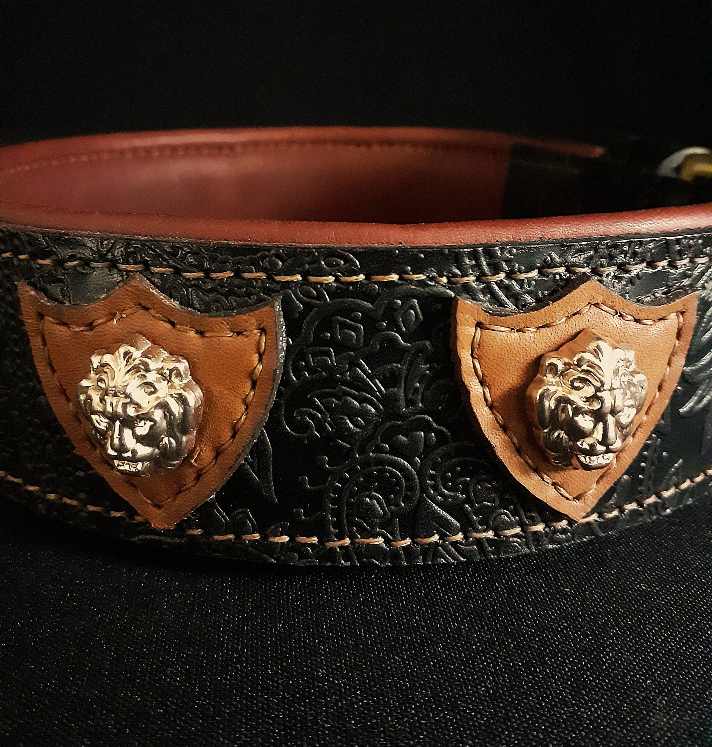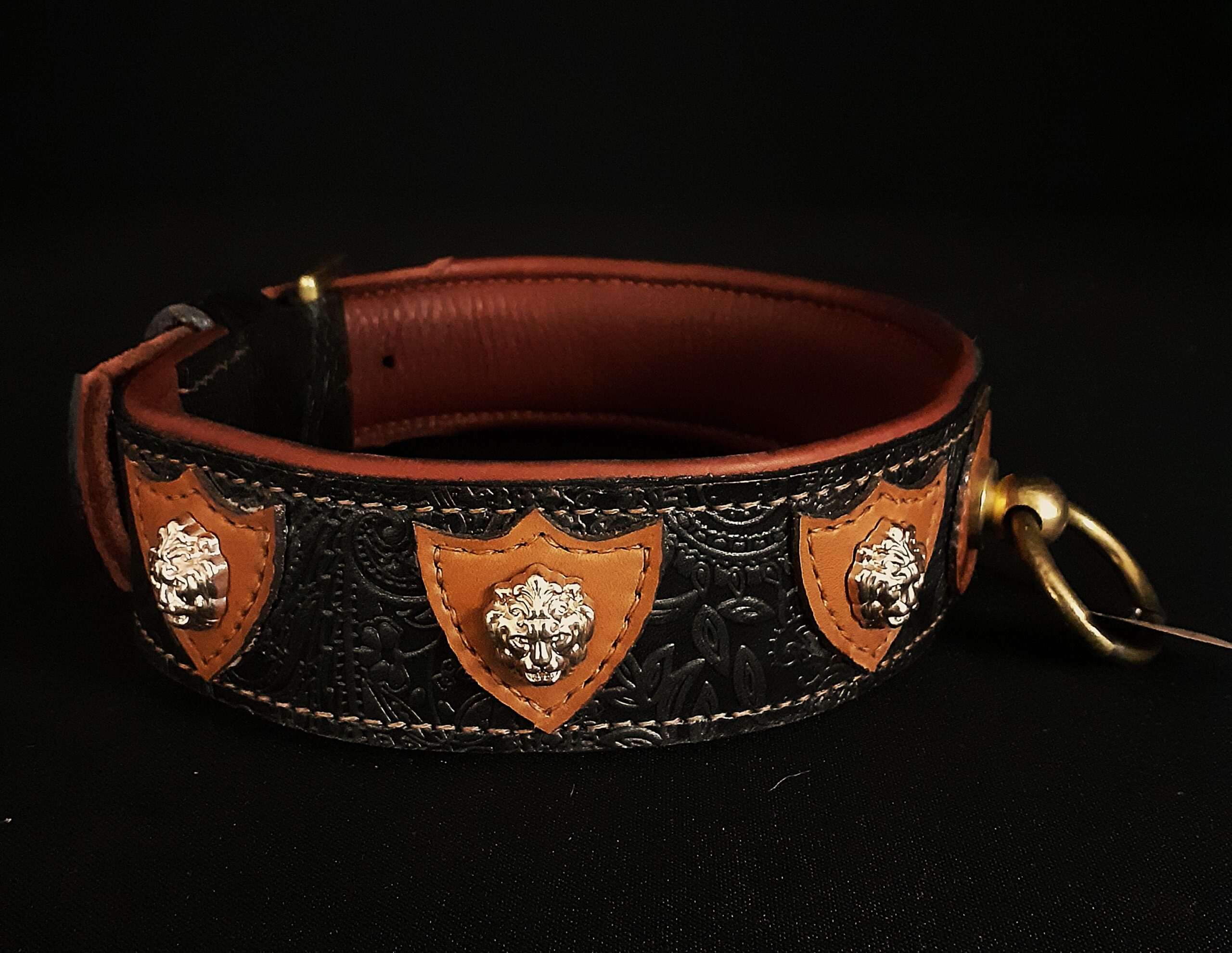 Collier pour chien « Cachemire » – Cuir noir et décor têtes de lions .