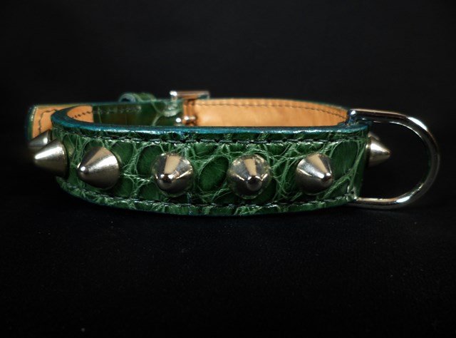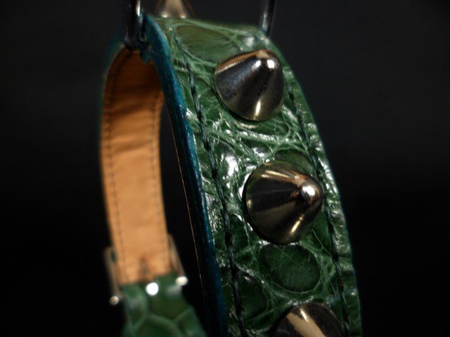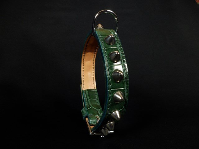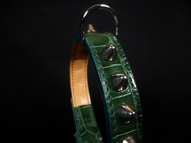 | Collier en croco, décors clous nickelés de forme conique |