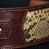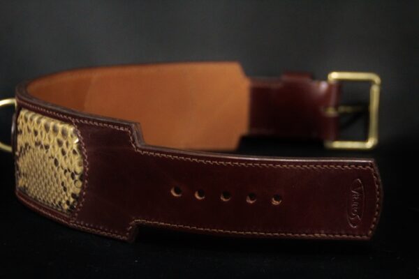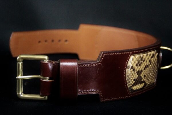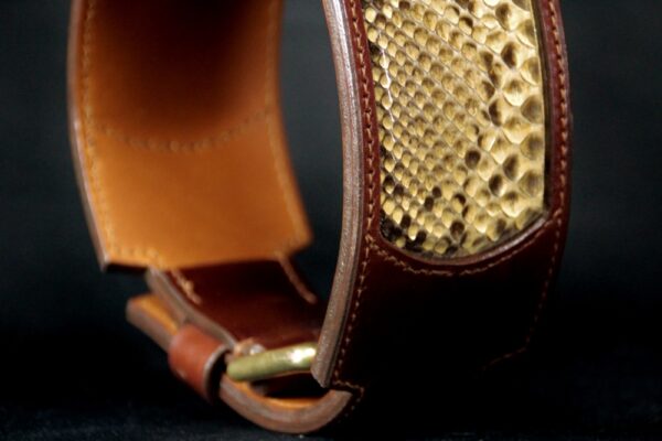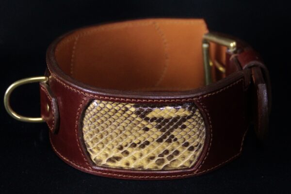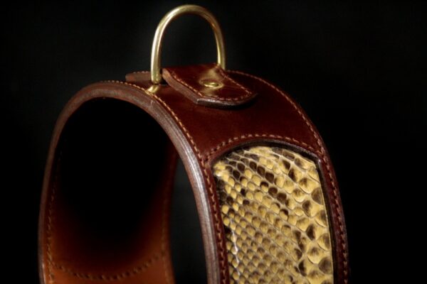 Le dessus du collier est en cuir de collet haut de gamme, sublimé par une incrustation authentique de peau de python, pour un rendu unique et raffiné. Le dessous est doublé en vachette ou collet, selon la taille, garantissant une excellente tenue et un contact doux sur le cou de l’animal.