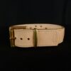 Finitions haut de gamme : boucle, attache, plaque et rivets en laiton massif, qui patineront élégamment avec le temps.