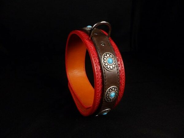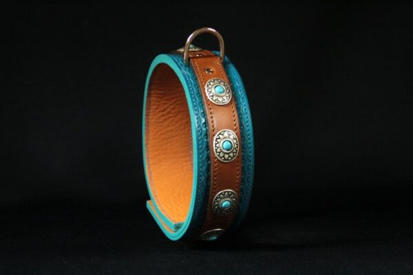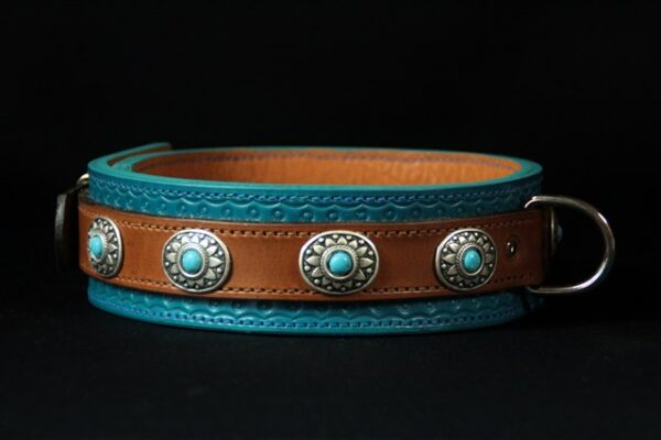 Offrez à votre compagnon un collier pour chien artisanal au style unique avec ce modèle « Mexicain » en cuir martelé, pensé pour conjuguer élégance exotique, confort et solidité. Fabriqué à la main dans notre atelier français, ce collier large de 5,5 cm est orné de perles turquoise et de décors métal argenté, pour un rendu haut de gamme au charme ethnique.