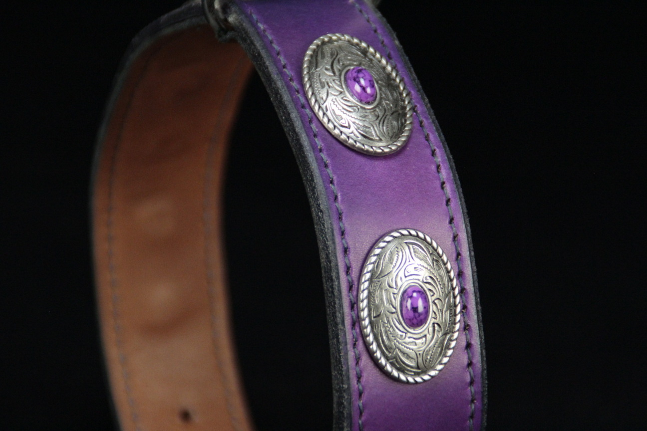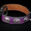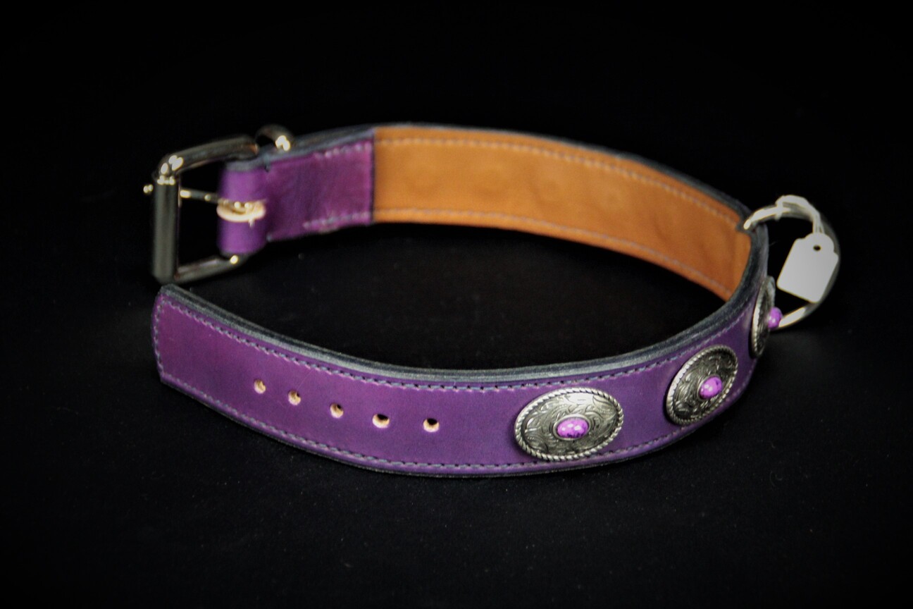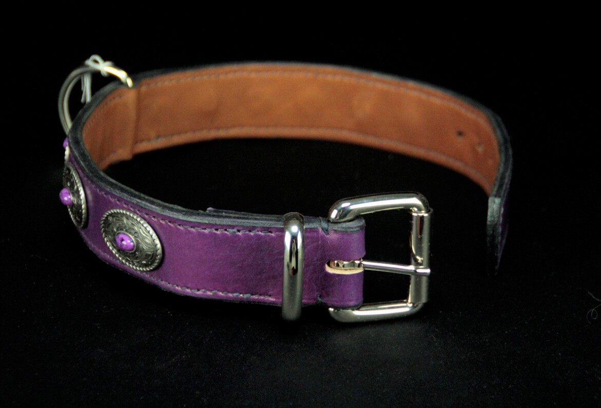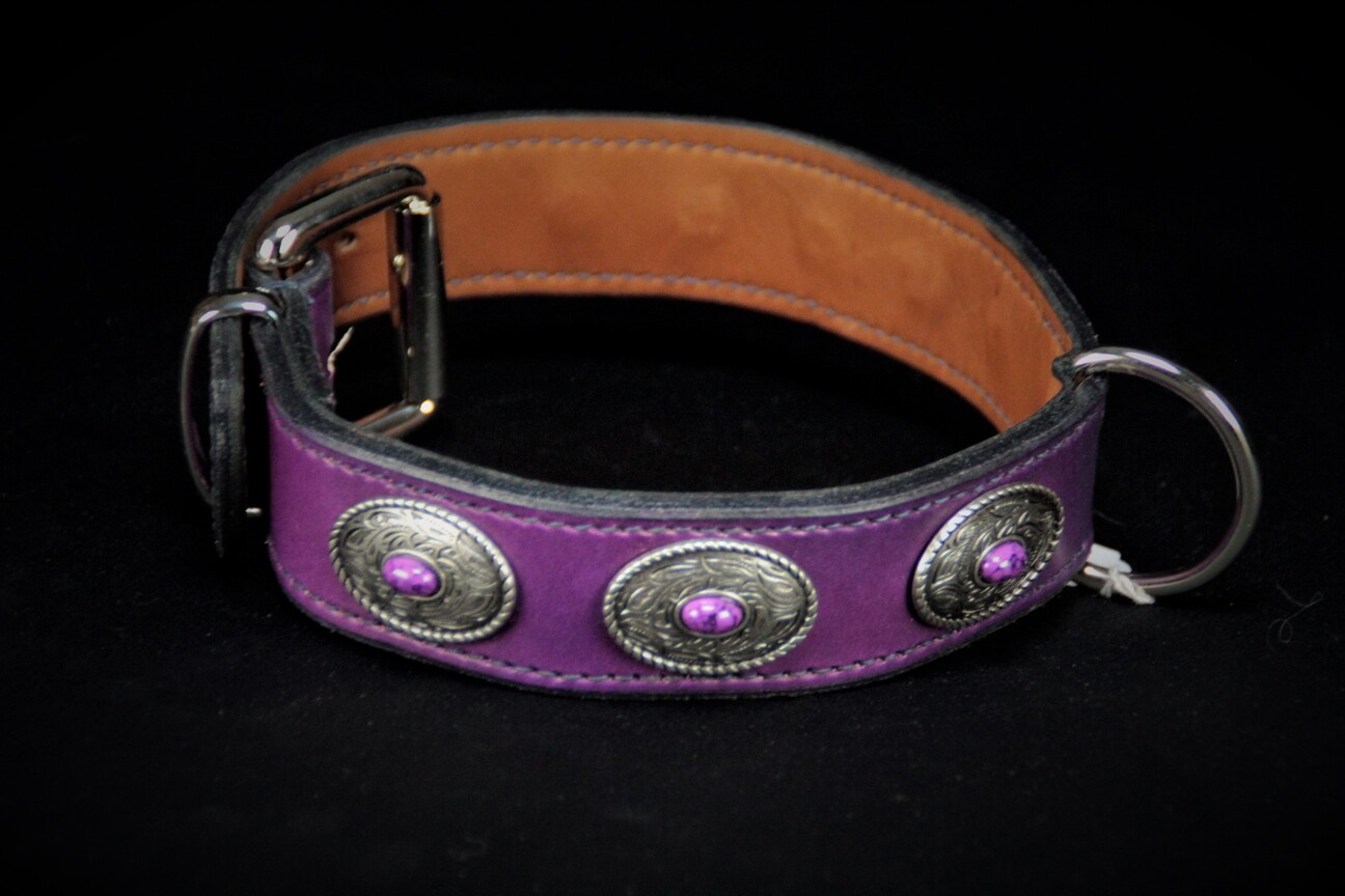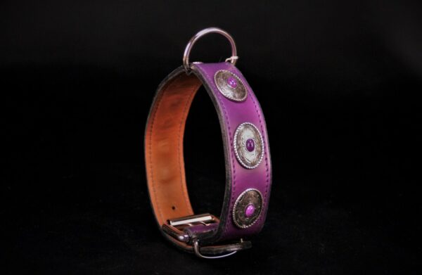 Collier pour chien en cuir de vachette violette , décors conchos 3,5 cm de large .