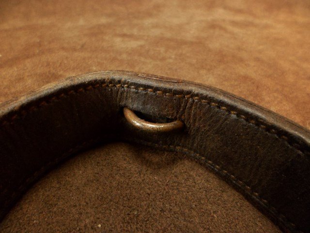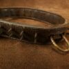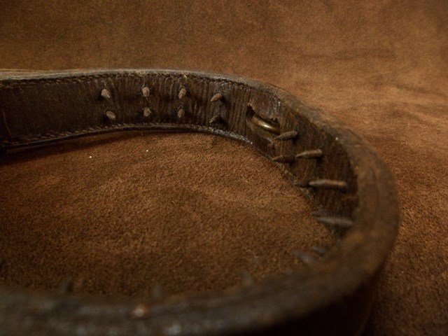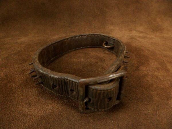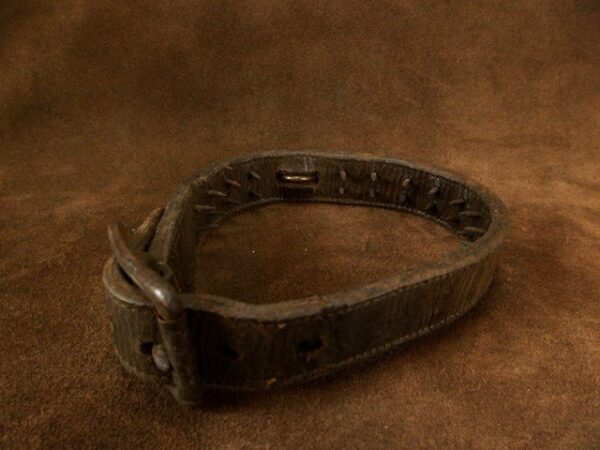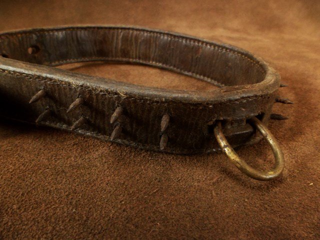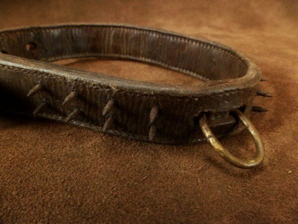 1 RARE collier en cuir « réversible », ce genre de collier est souvent, à tort , considéré comme un collier anti-loup. C’est en réalité un collier de dressage, les clous se mettent à l’intérieur du collier , en contacte avec le cou du chien afin de dresser le chien, pour ne pas tirer en laisse par exemple. Une fois le dressage du chien terminé, on peut mettre les clous à l’extérieur du collier, grâce au dés pour accrocher la laisse qui est réversible (voir photo et photo du catalogue datant de 1850)