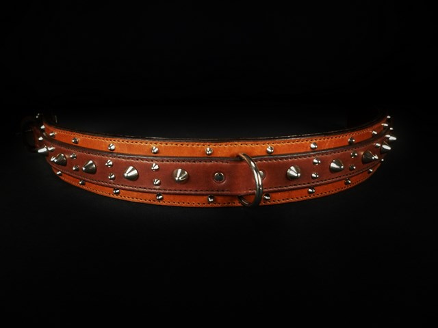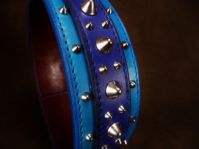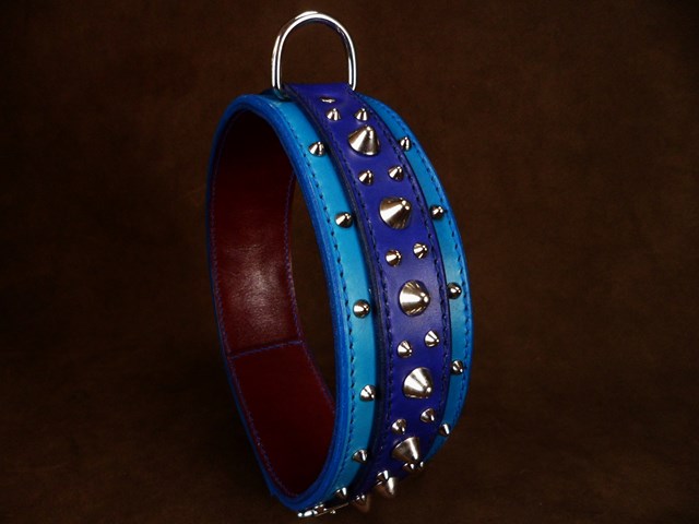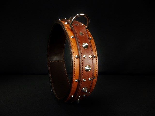 Collier pour chien en cuir de vachette bicolore avec clous coniques 5,5 cm .