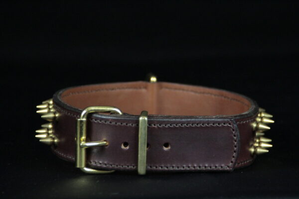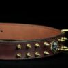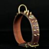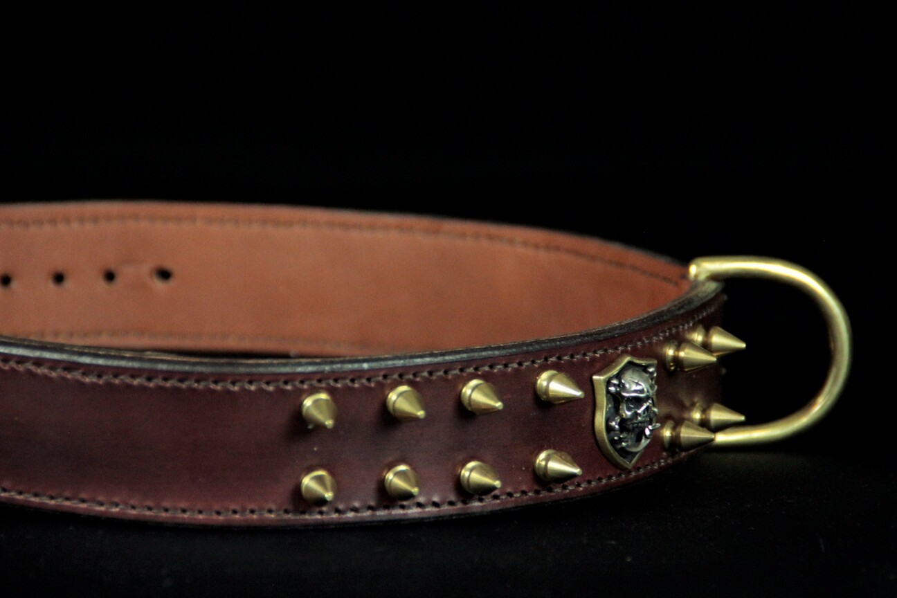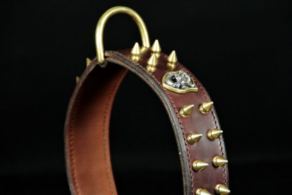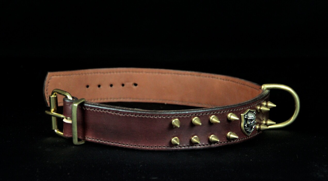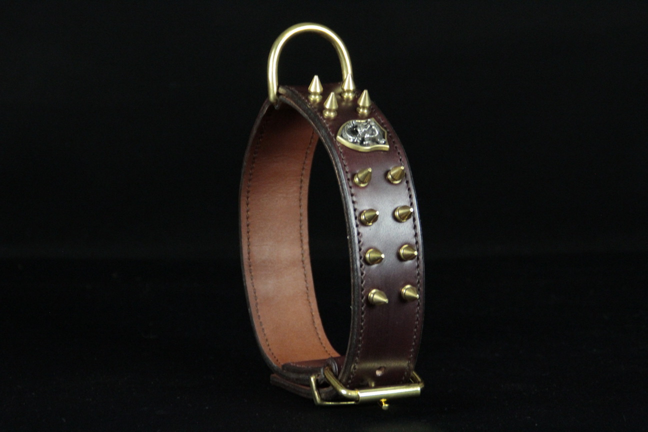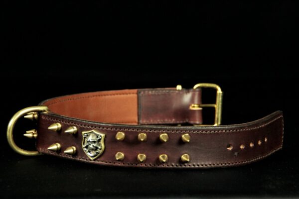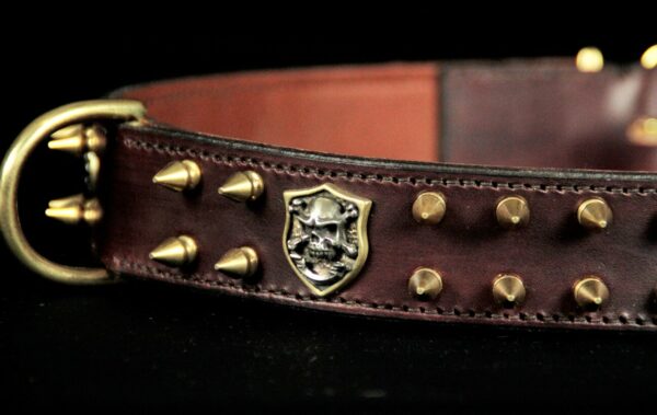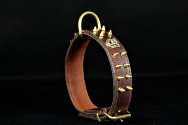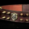 Collier pour chien en cuir de vachette marron avec ogives et tête de mort – 4 cm de large .