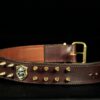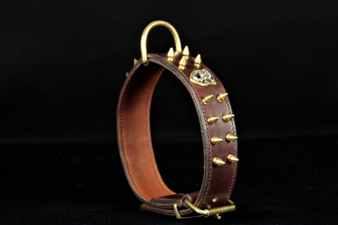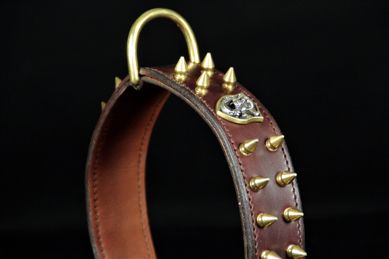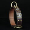 Collier pour chien en cuir vachette marron ,décors ogives laiton massif et tête de mort .