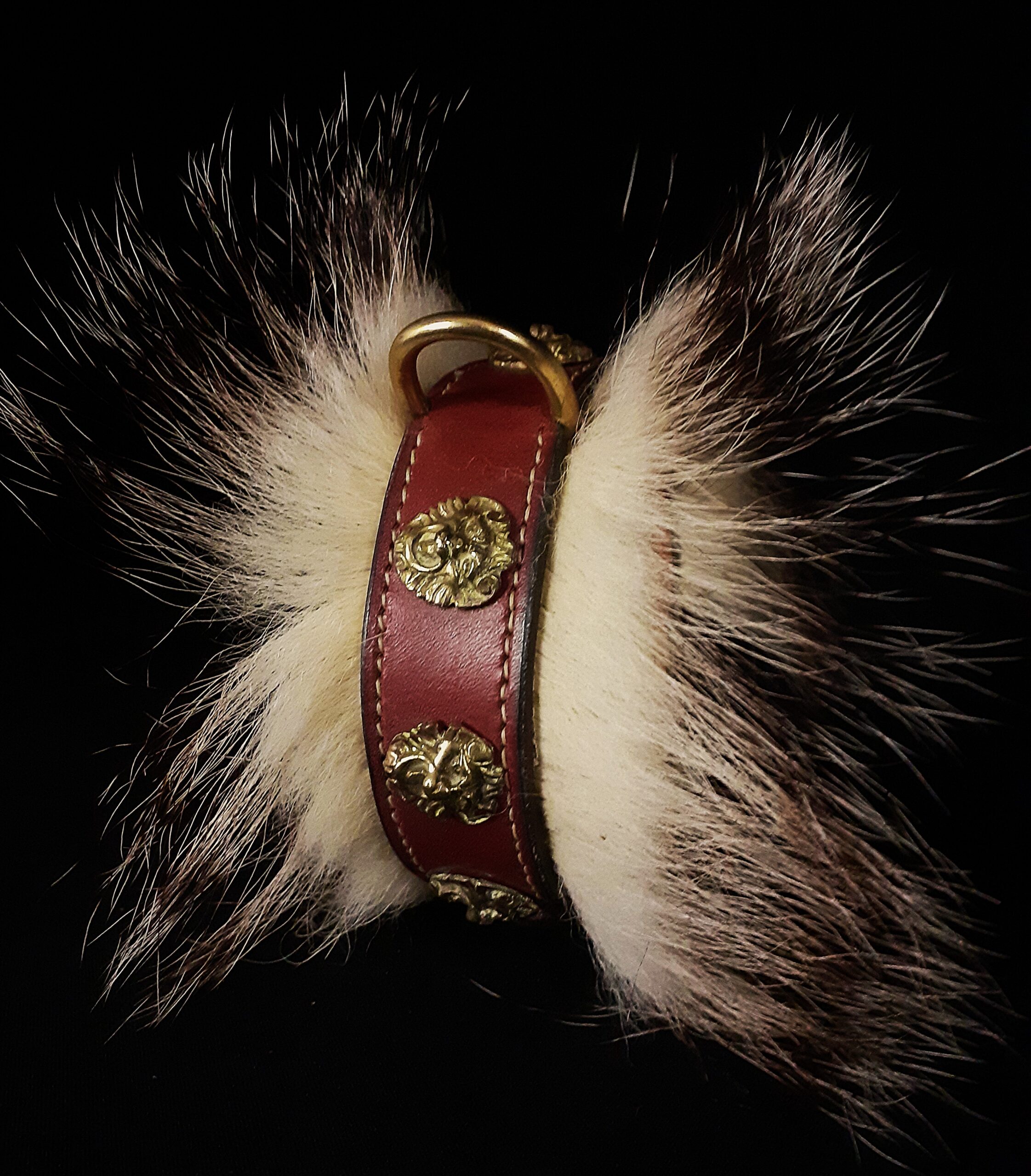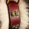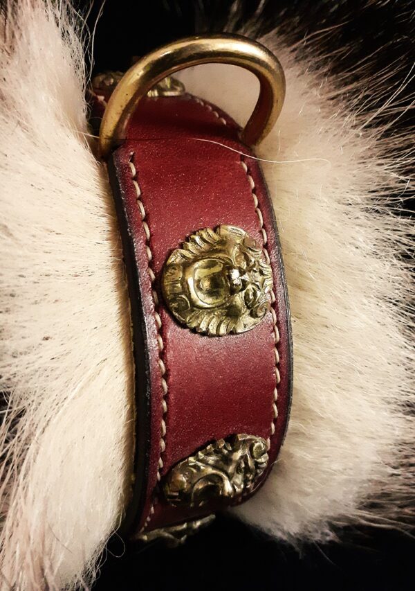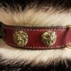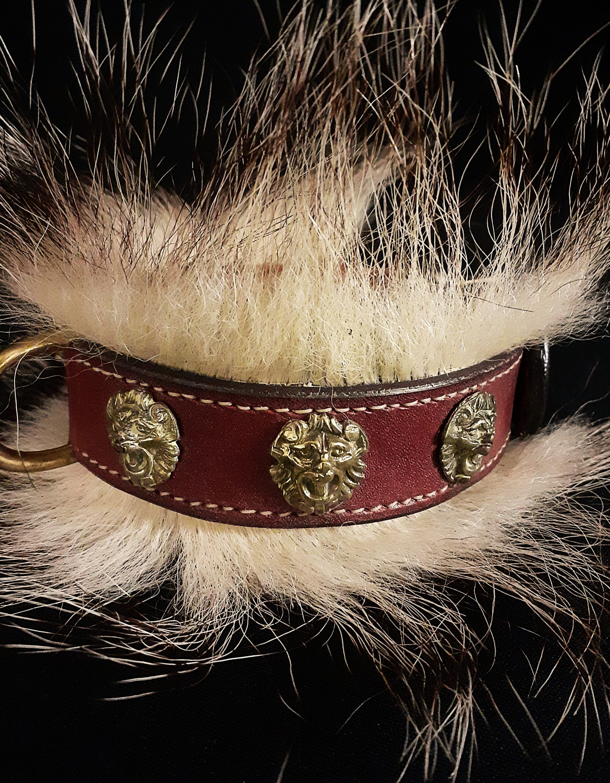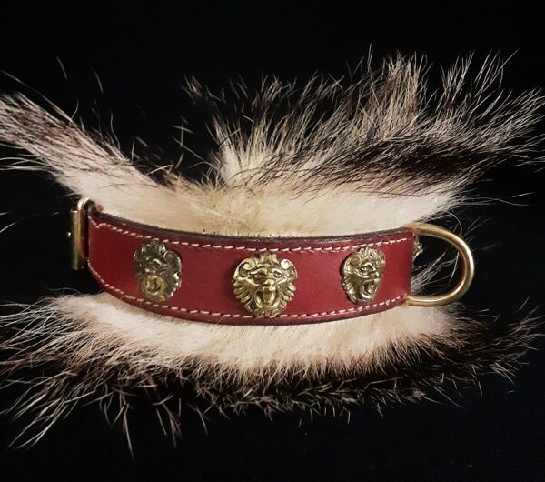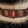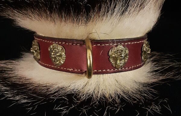 Collier spécial Bouledogue Français en cuir vachette poils de blaireau têtes de lion bronze 3 cm de Large .