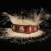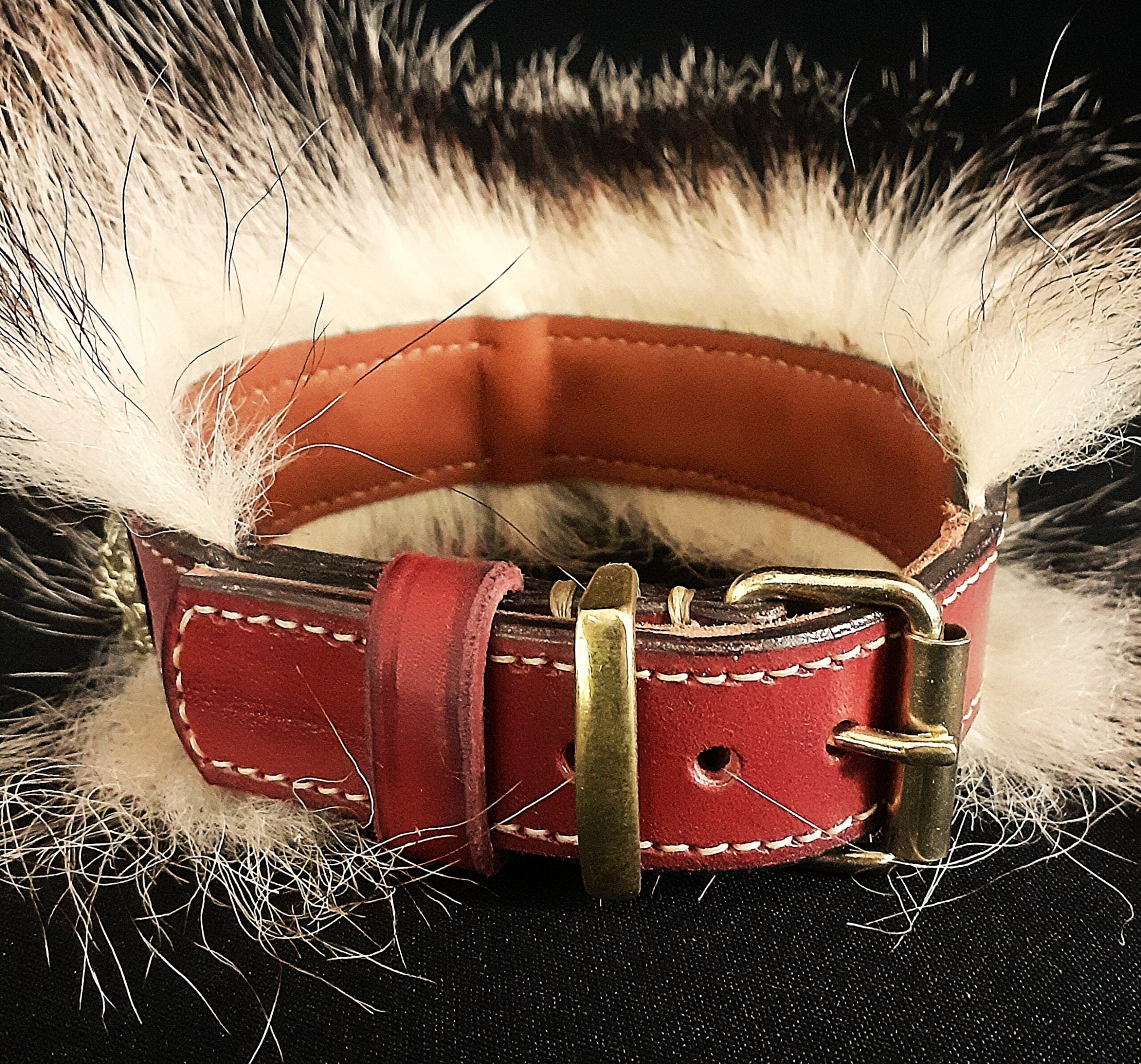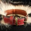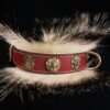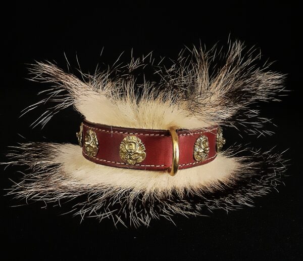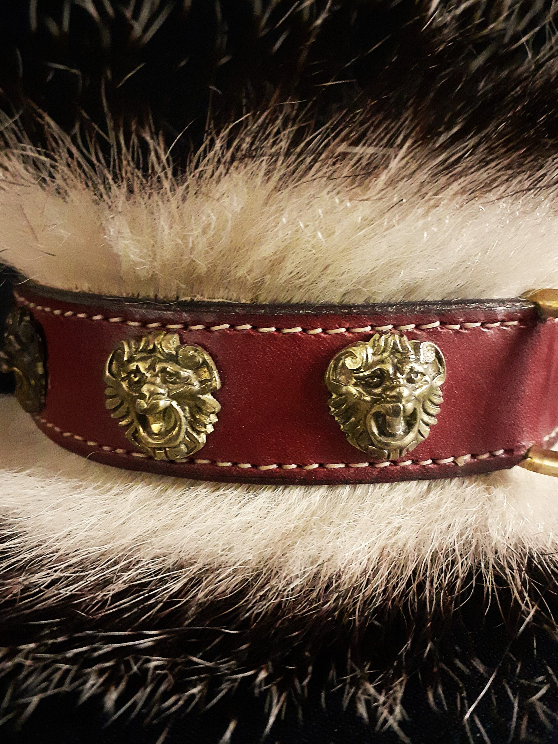 Collier spécial Bouledogue Français en cuir vachette poils de blaireau têtes de lion bronze 3 cm de Large .
