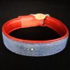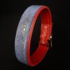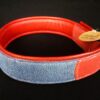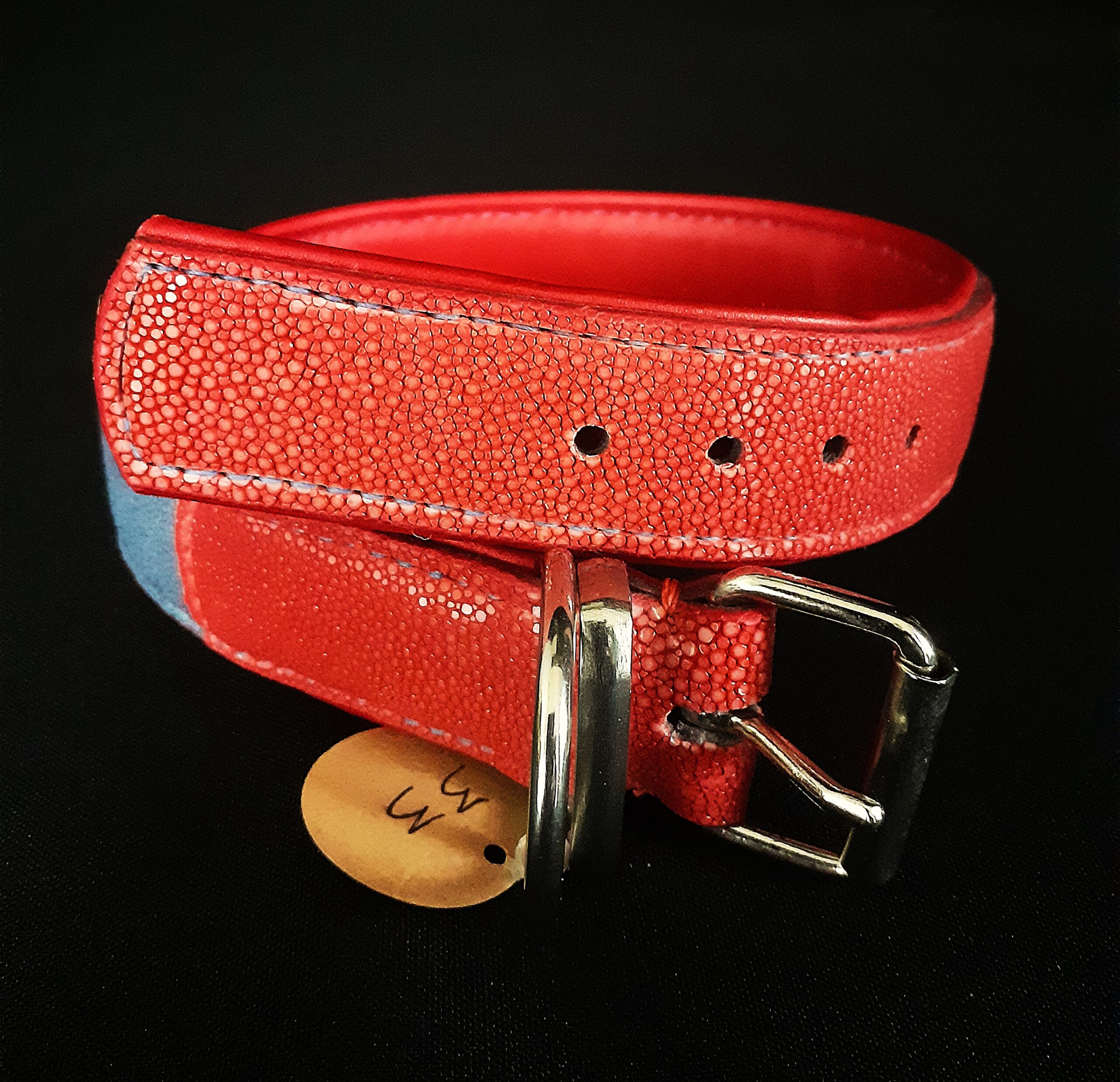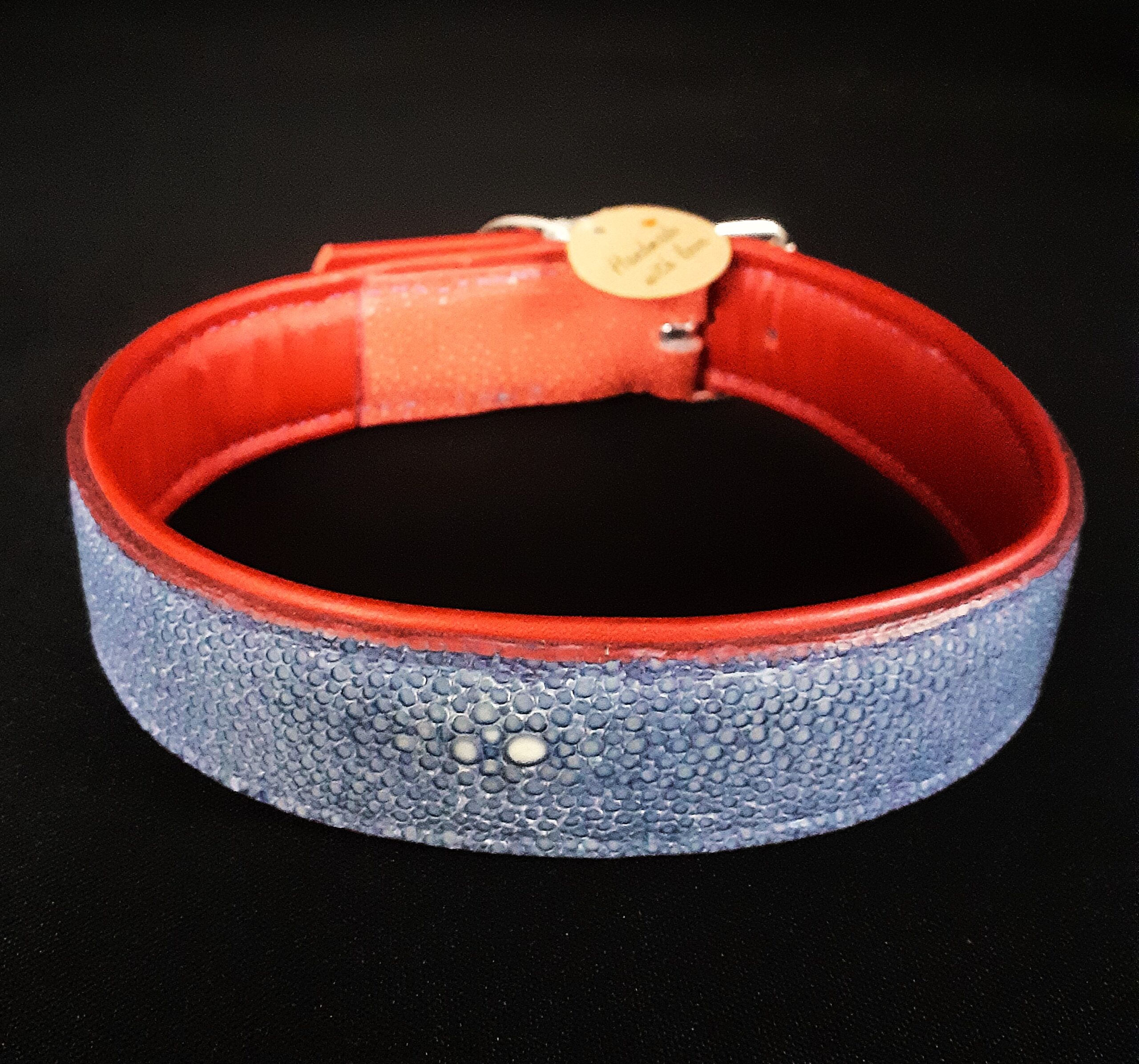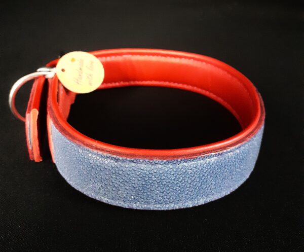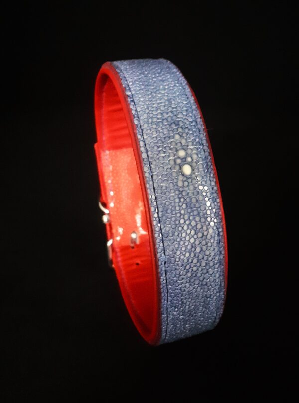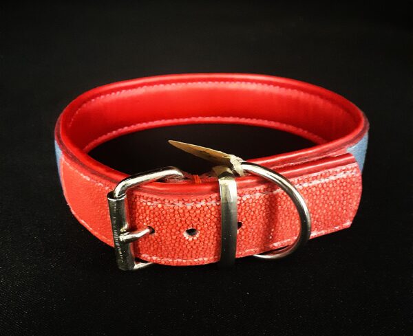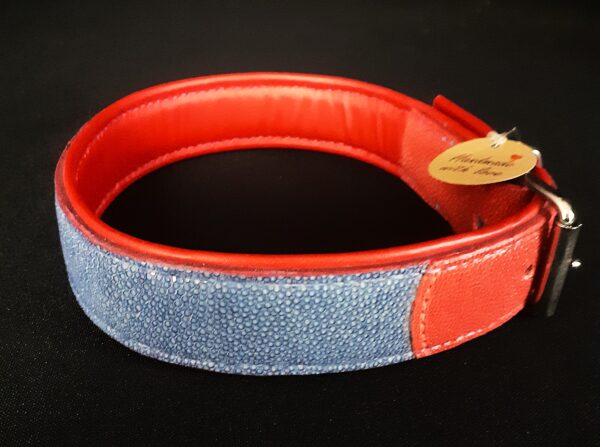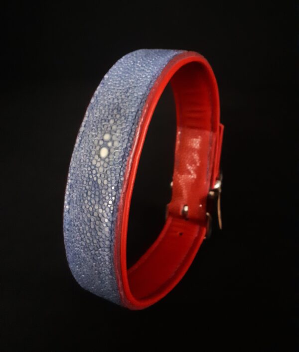 Collier pour chien en peau de galuchat bleu et rouge pour les extrémités .