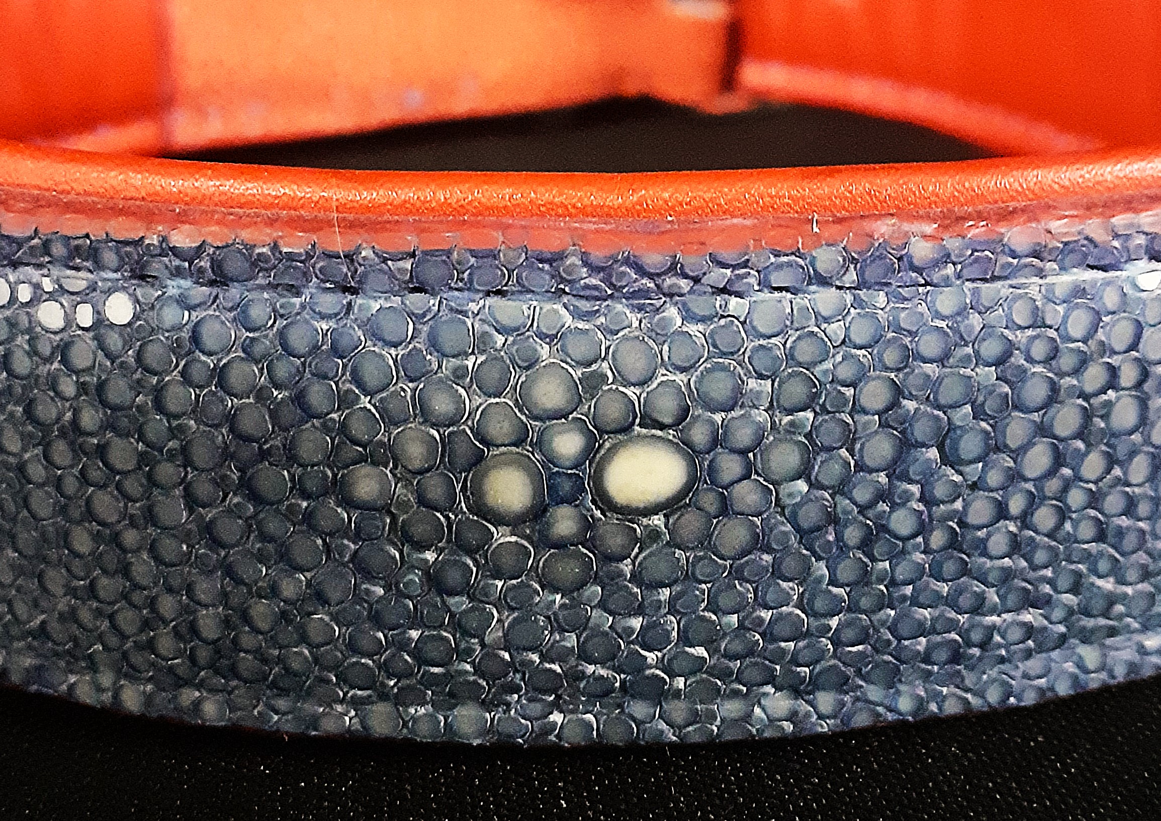 Cuir dessus : galuchat bleu et rouge pour les extrémités .