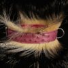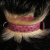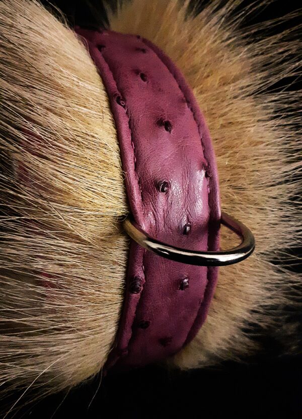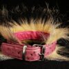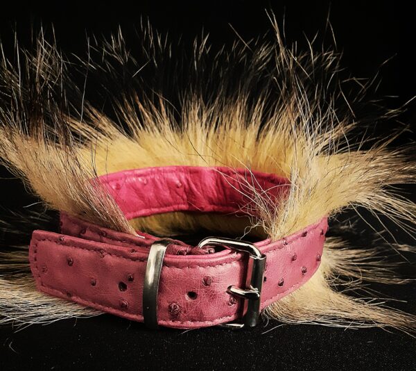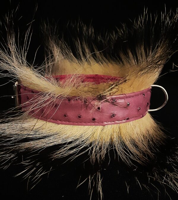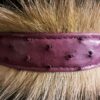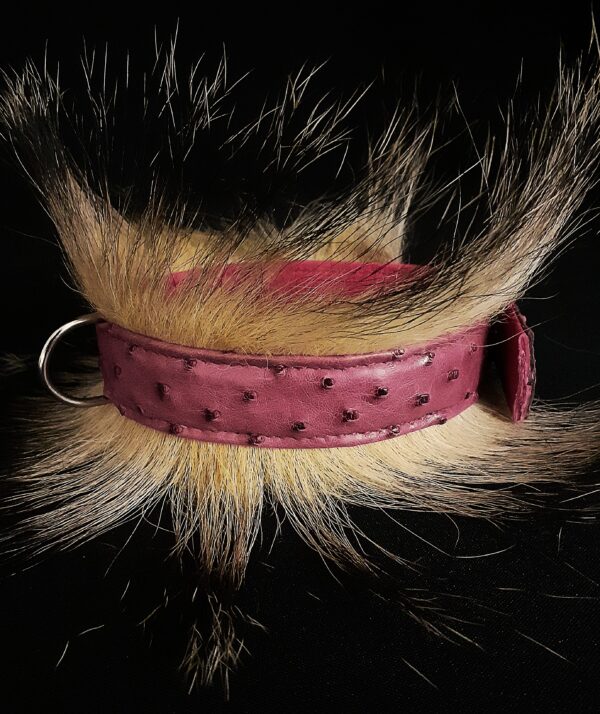 Collier pour Bouledogue Français en peau d’autruche orné de poils de blaireau, couleur vieux rose .