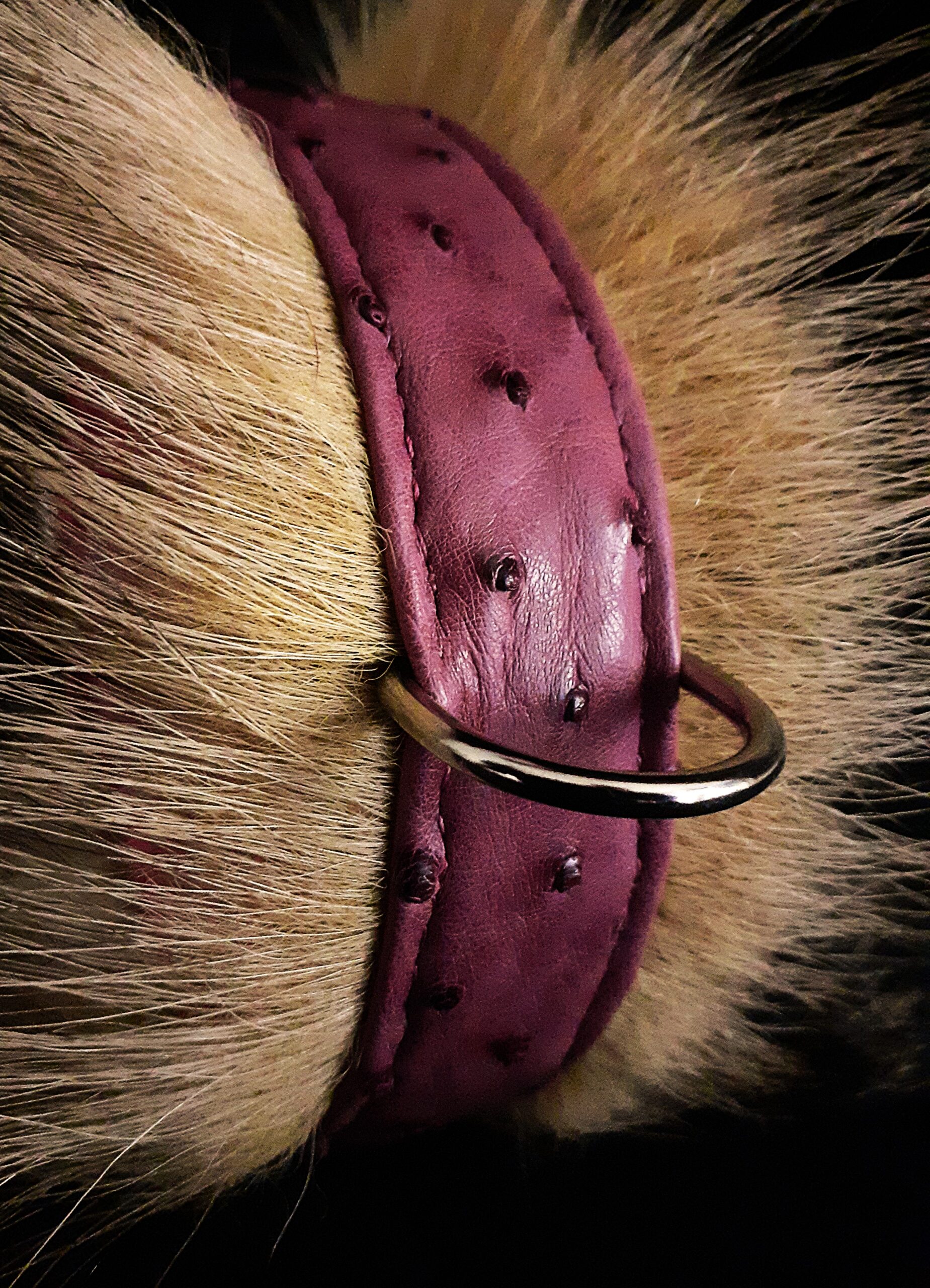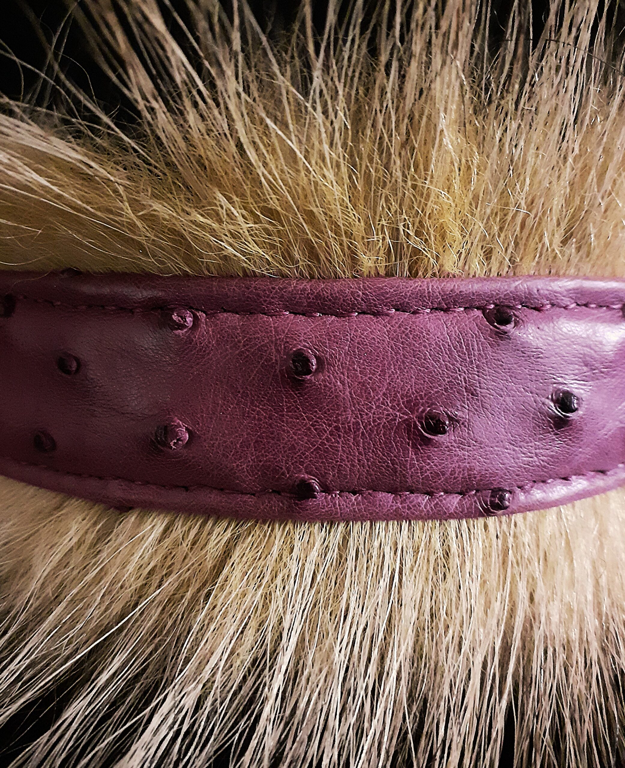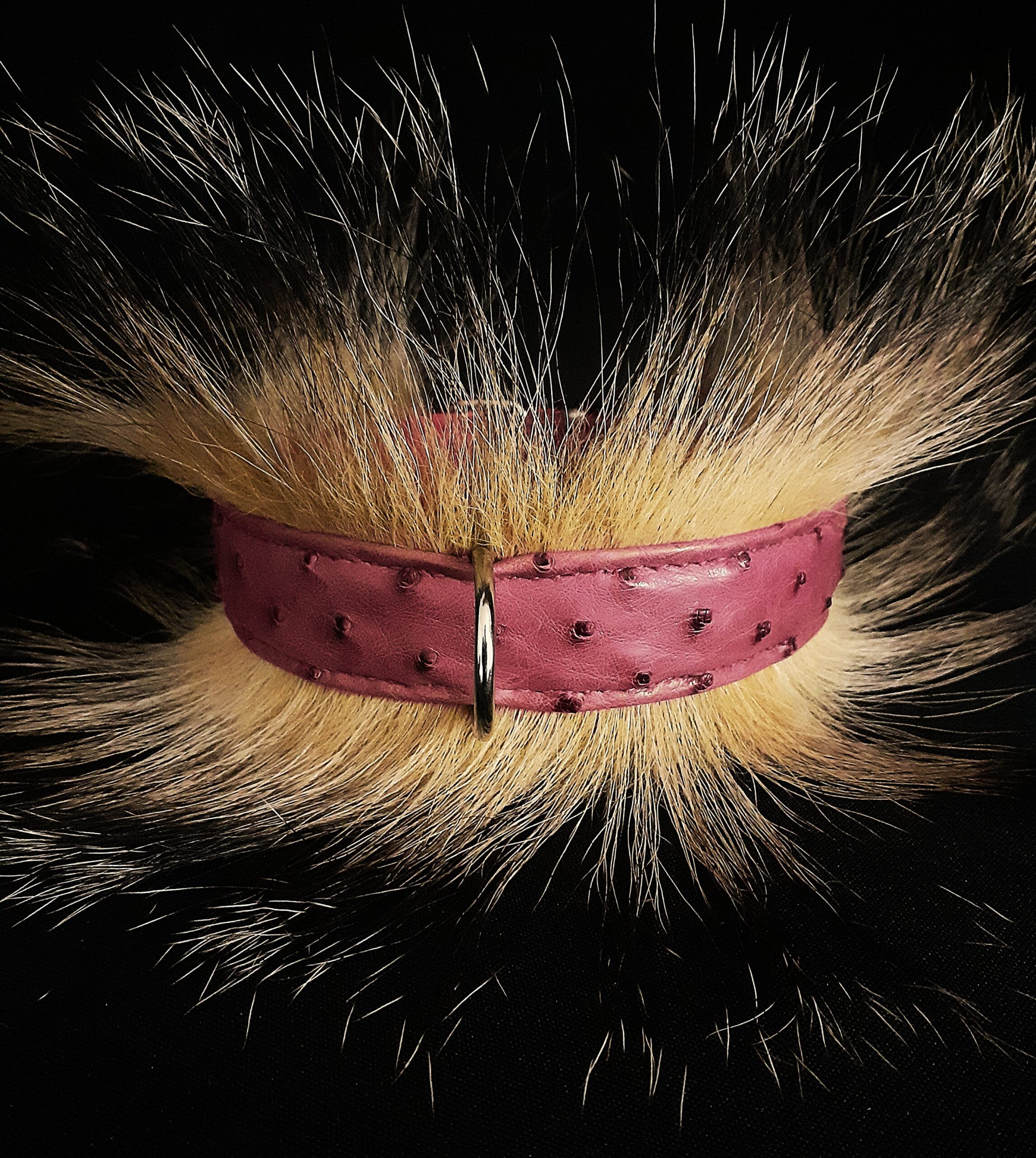 Collier pour Bouledogue Français en peau d’autruche orné de poils de blaireau, couleur vieux rose .