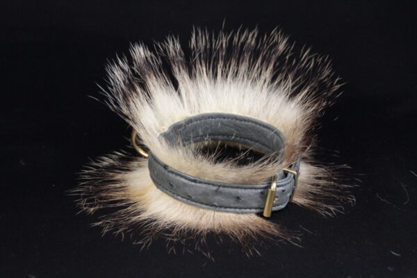 Collier pour chien en peau d’autruche grise avec poils de blaireau – Artisanat haut de gamme & élégance naturelle .