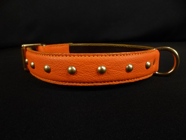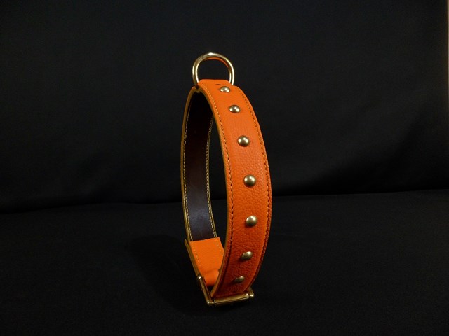 Collier pour chien en taurillon , petits clous ronds en laiton 3,5 cm Large .