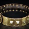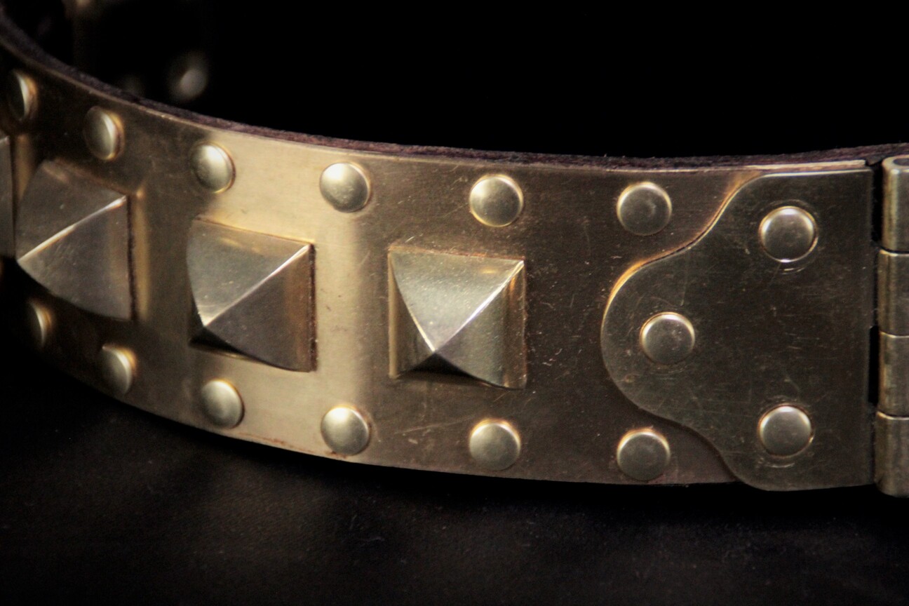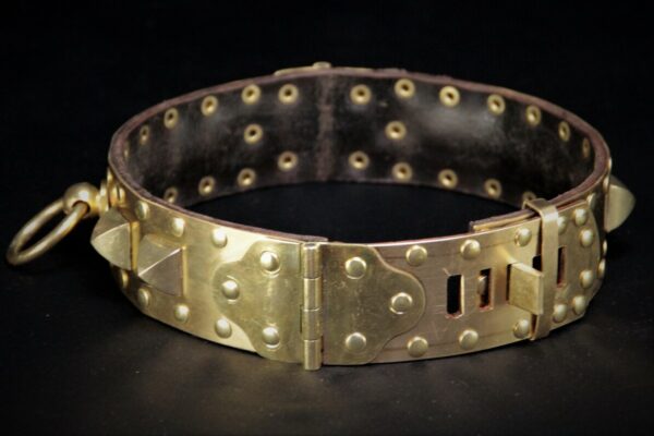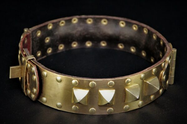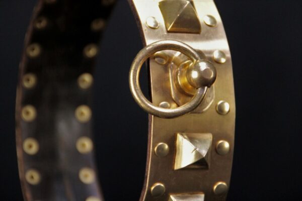 Une plaque en laiton massif montée sur du cuir épais, fidèle aux colliers de protection d’époque.