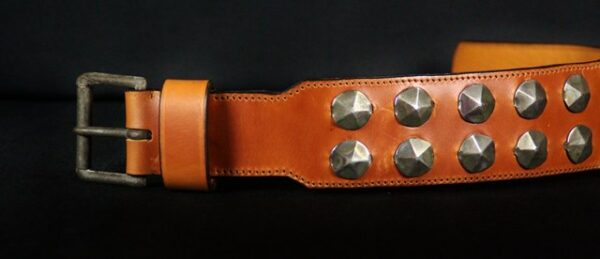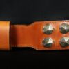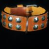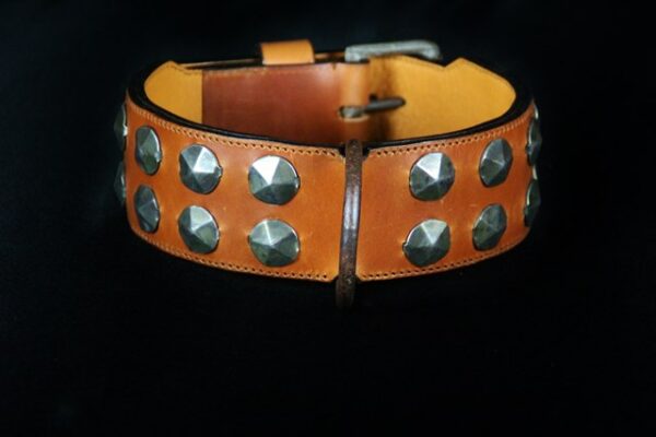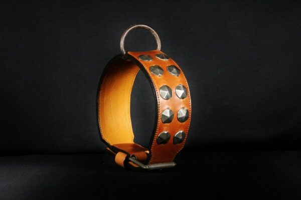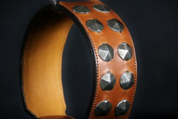 Collier pour chien « Médiéval » – Cuir marron clair, métal patiné – 7 cm de large – Pièce unique .