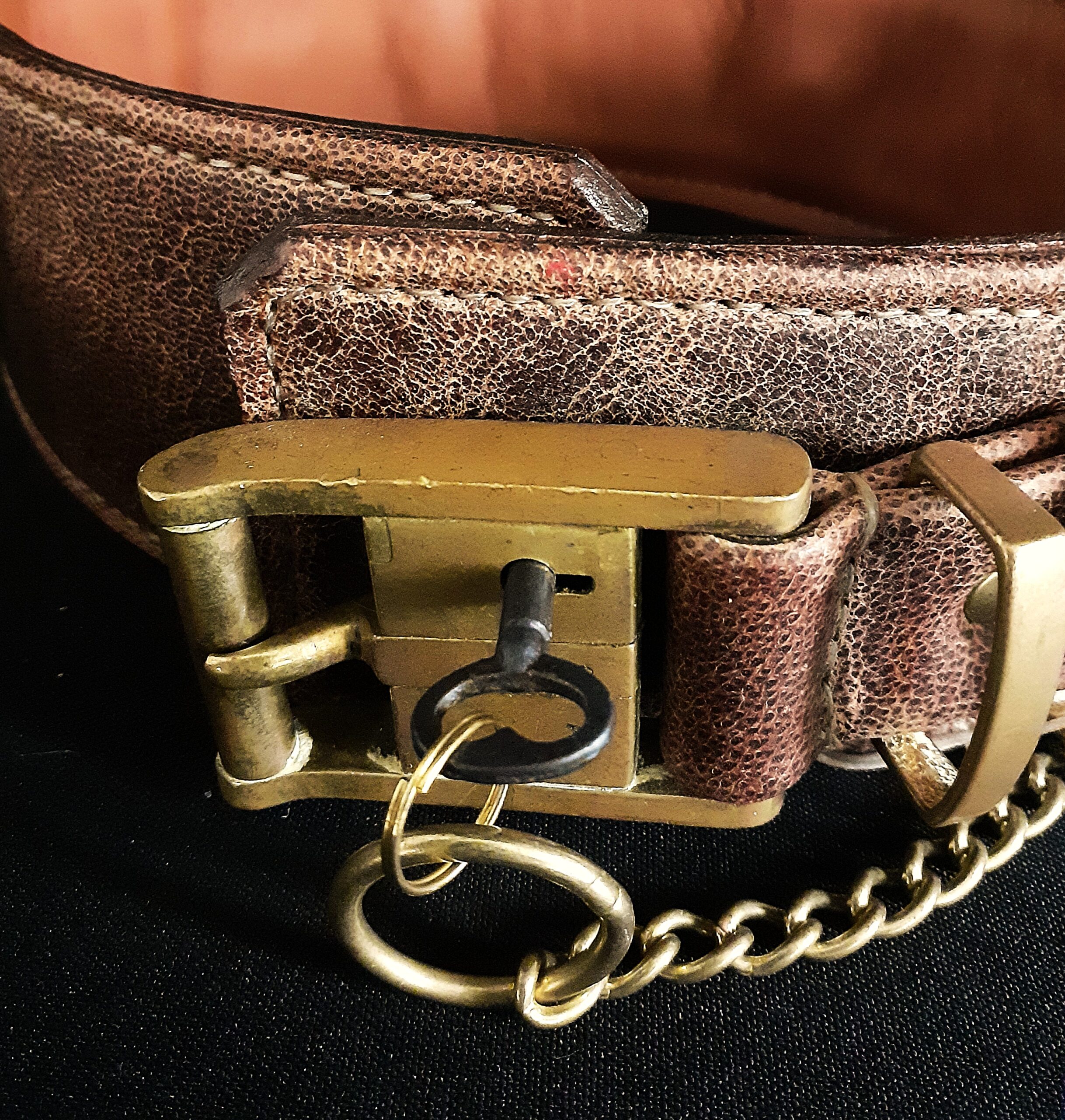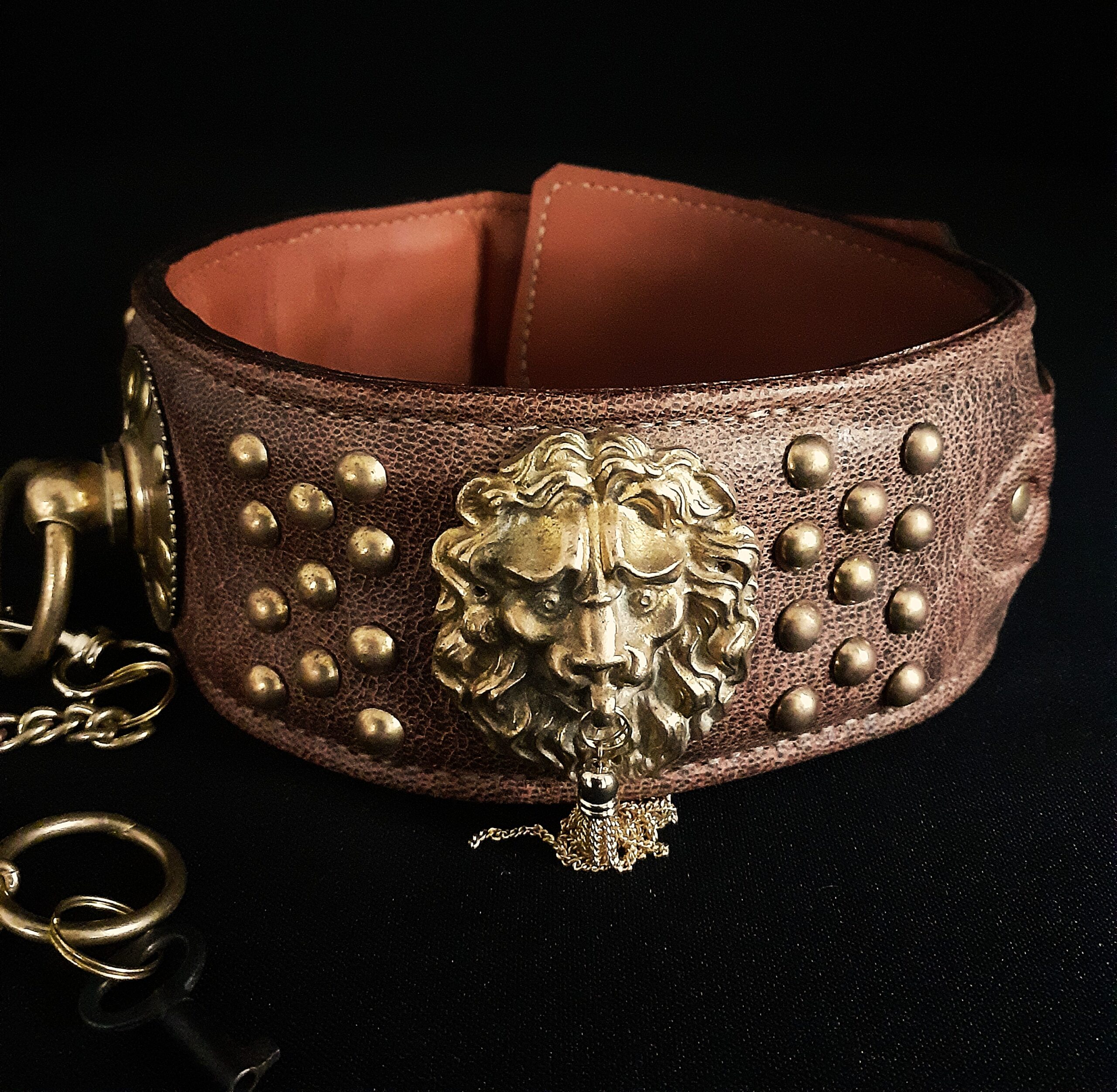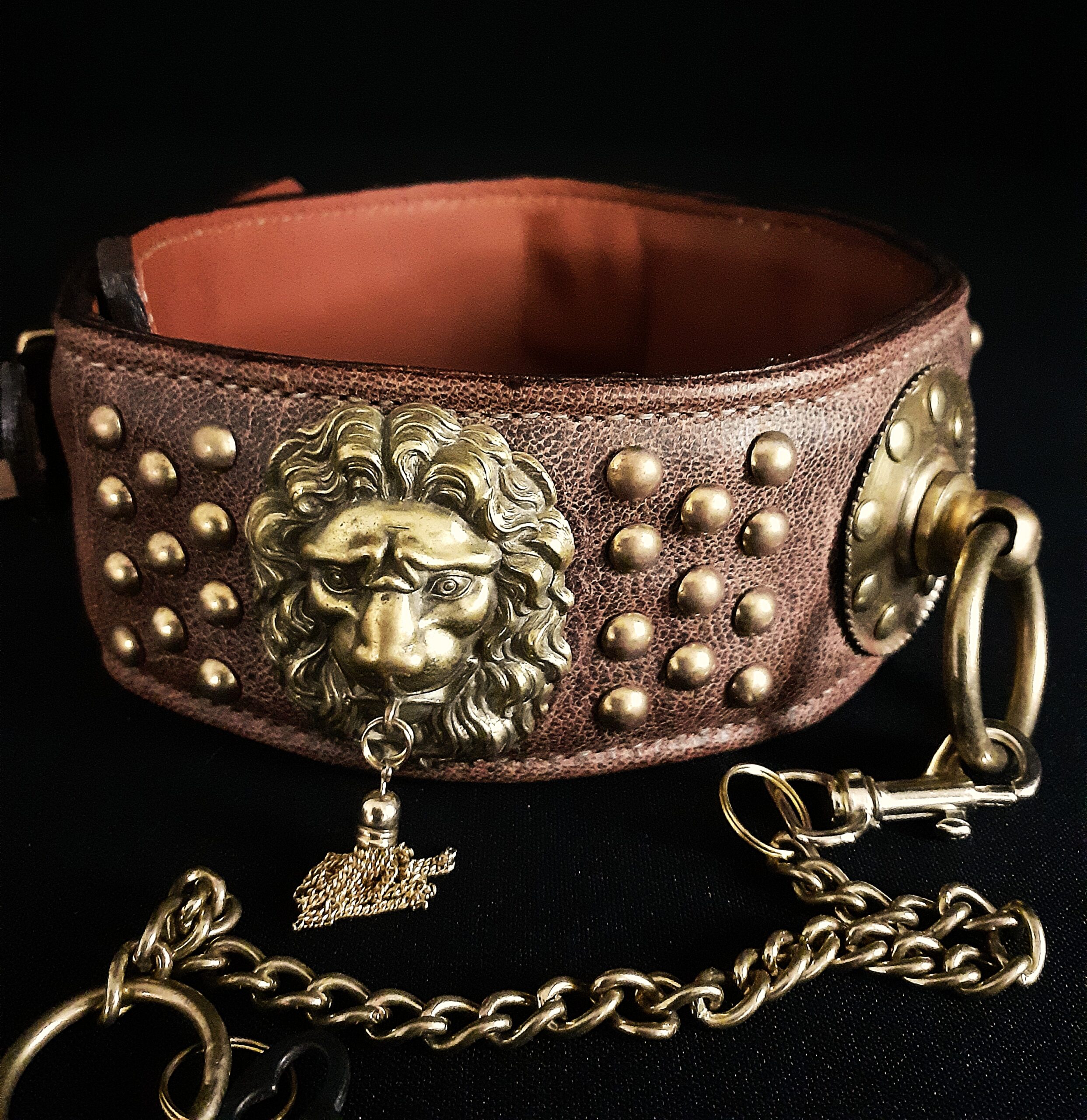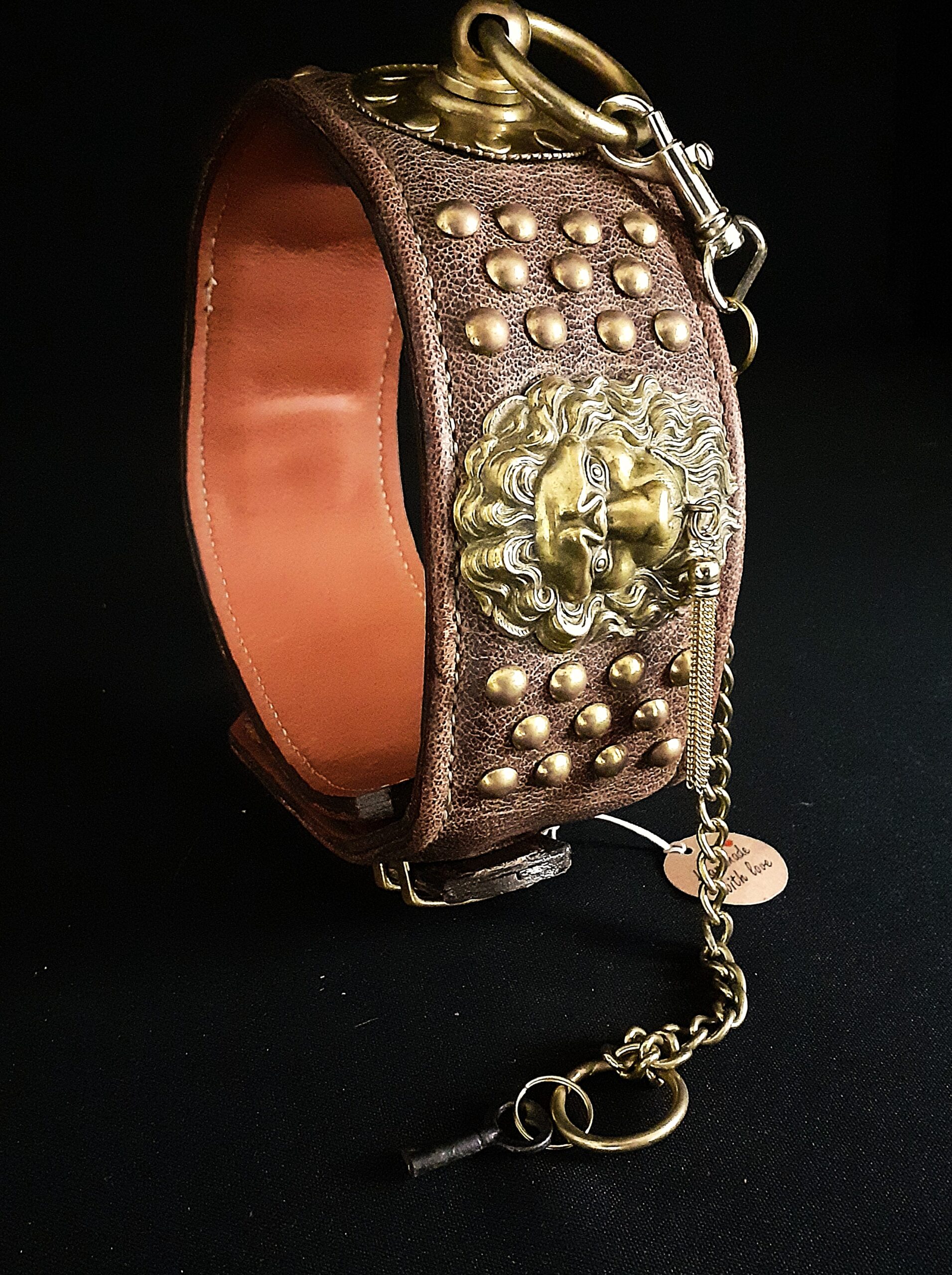 Collier pour chien en cuir avec têtes de lions & boucle à cadenas – Laiton massif & bronze – 6,5 cm – Modèle unique .