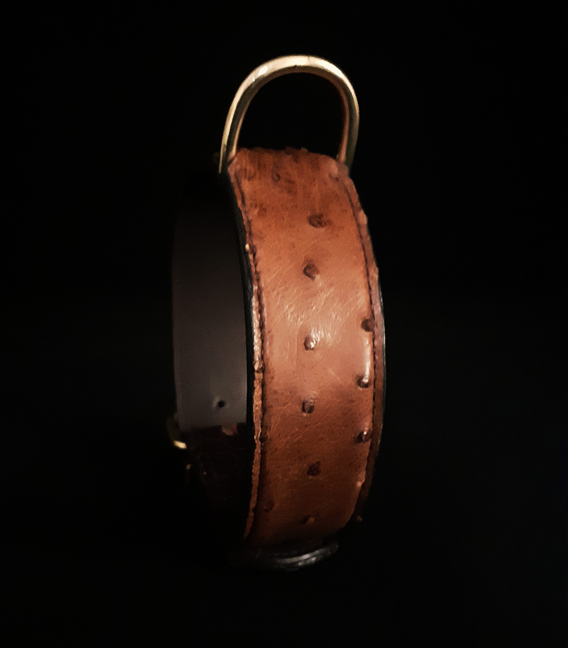 Le dessus du collier est réalisé en cuir d’autruche marron moyen, réputé pour son grain naturel, sa souplesse et sa résistance. Les extrémités sont habillées de cuir de crocodile marron foncé, pour une touche de caractère et de distinction. Le dessous, en cuir de veau marron foncé, garantit douceur et confort au contact du cou de votre chien.