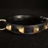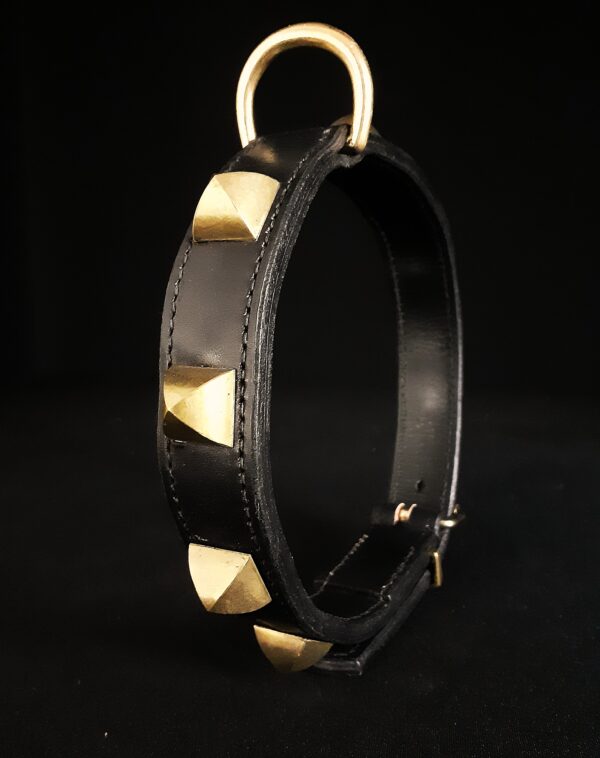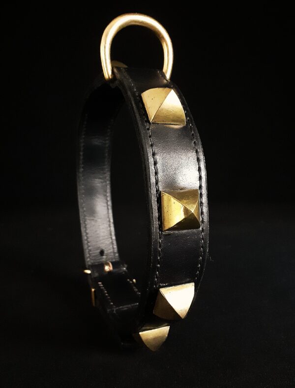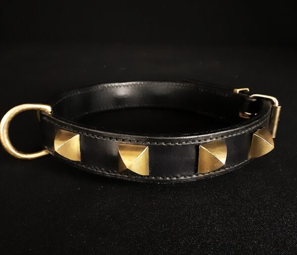Collier pour chien en cuir noir et pyramides en laiton massif .