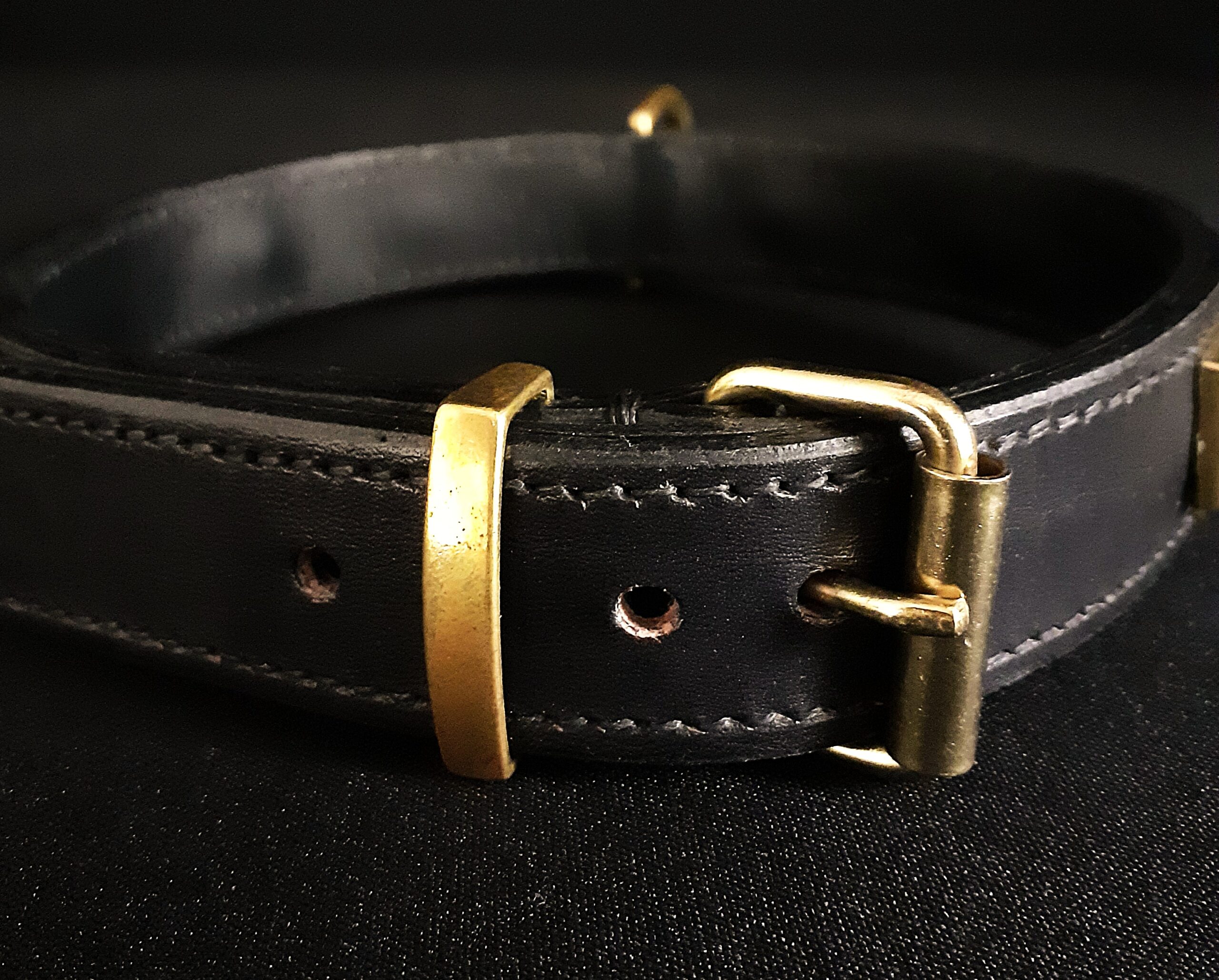 Clous pyramides, boucle, attache en D et passant en laiton massif : des finitions solides, résistantes à l’oxydation et au style affirmé.