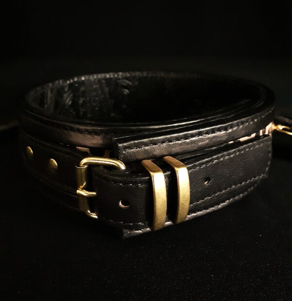 Boucle, passants, attache, rivets et attaches pompons sont en laiton massif .