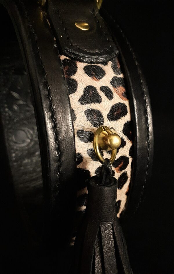 Cuir dessus : collet noir, pompons agneau noir et vachette imprimé panthère .