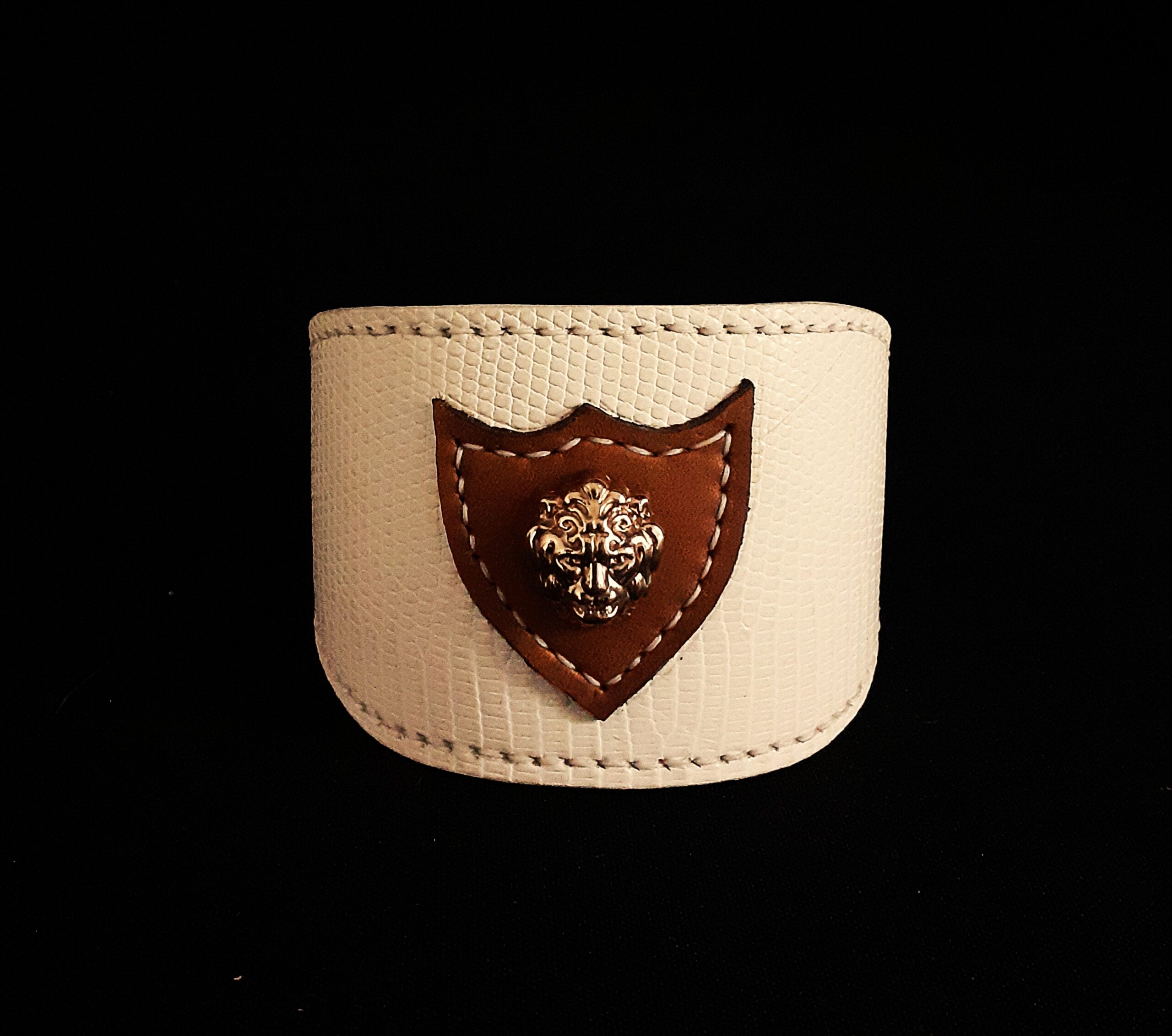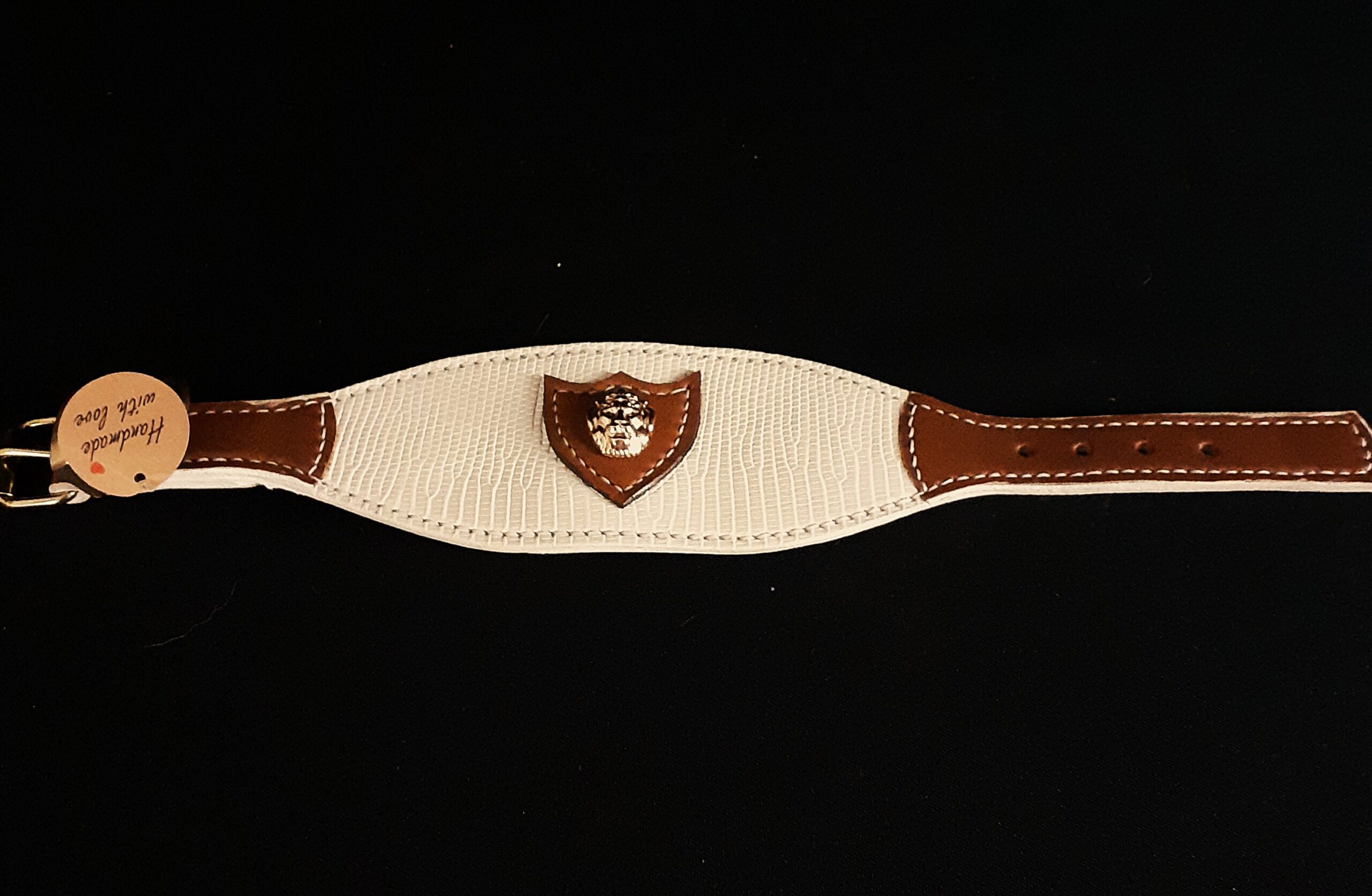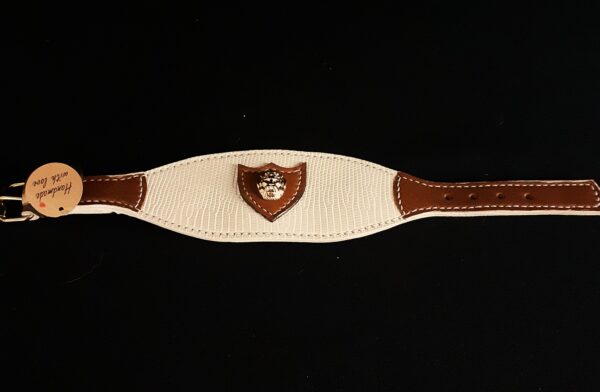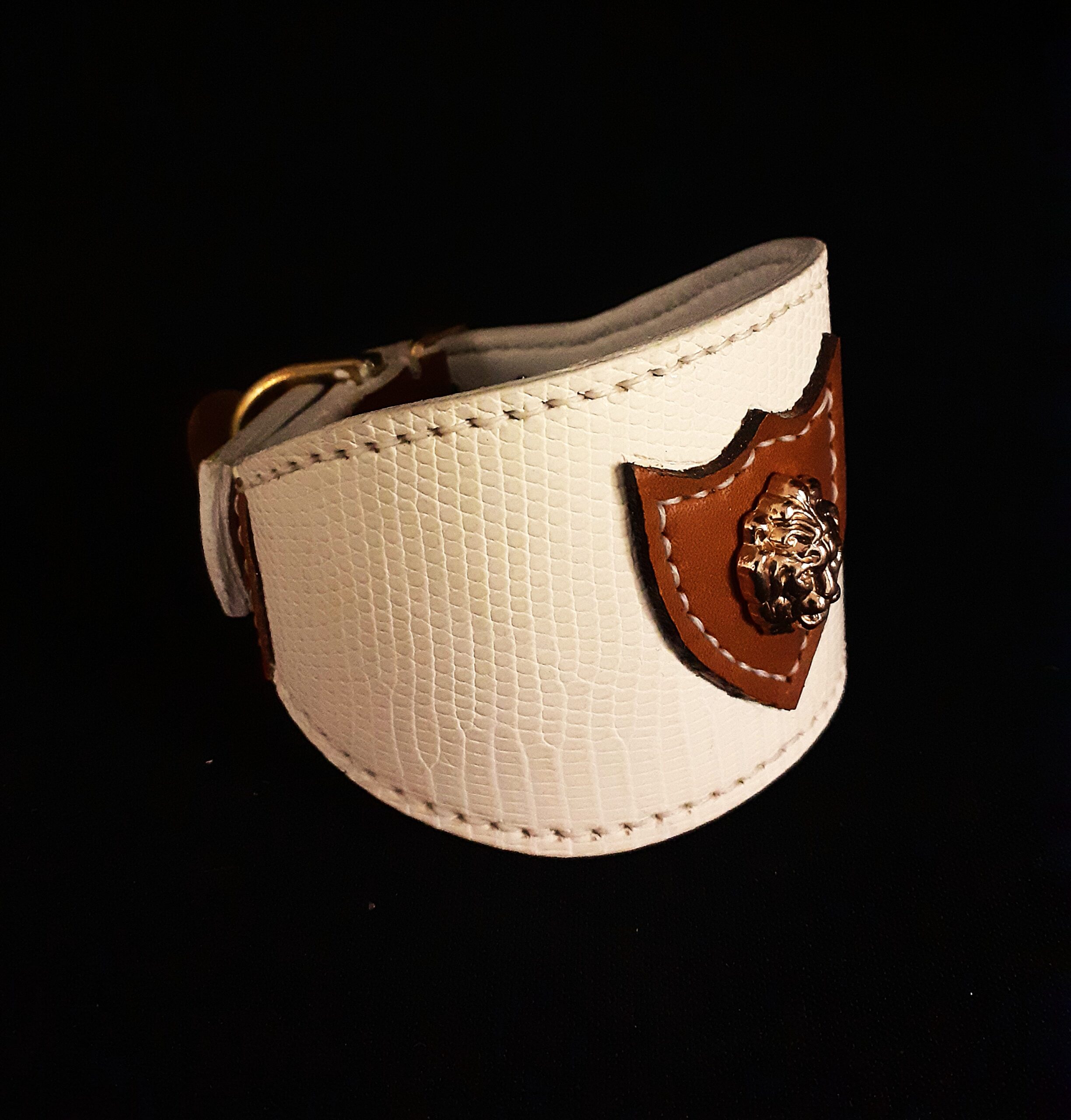 Collier pour lévrier en lézard blanc, agneau et têtes de lion – 6 cm de large – Artisanat d’exception .