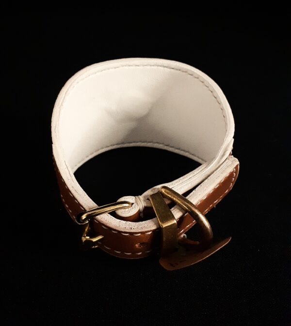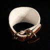 Offrez à votre lévrier un collier unique mêlant raffinement, noblesse des matières et fabrication artisanale française. Ce modèle associe le cuir exotique de lézard blanc à la douceur de l’agneau marron clair, rehaussé par des têtes de lion en laiton massif, pour un style à la fois élégant et audacieux.