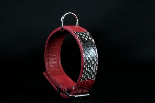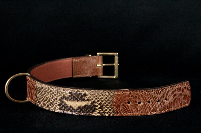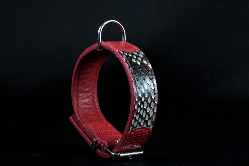 Offrez à votre chien un collier au design luxueux et sauvage avec ce modèle artisanal « Python & Lézard ». Fabriqué à la main dans le respect des techniques traditionnelles, ce collier associe cuirs exotiques véritables et finitions métalliques au choix, pour un résultat à la fois sophistiqué, résistant et unique.