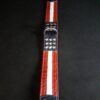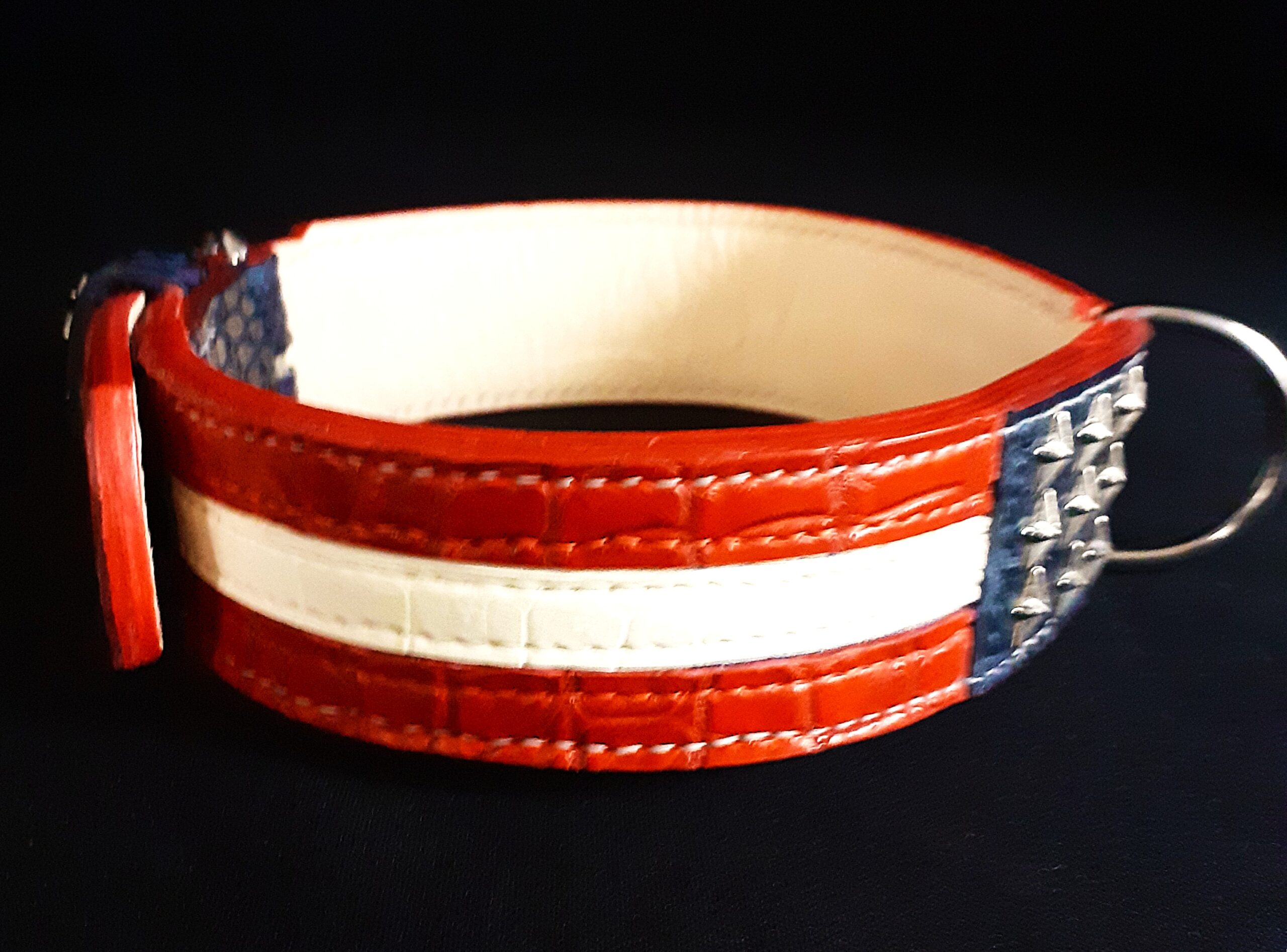 Cuir dessus : croco , rouge , blanc et bleu .