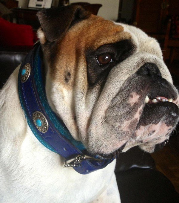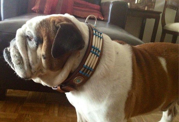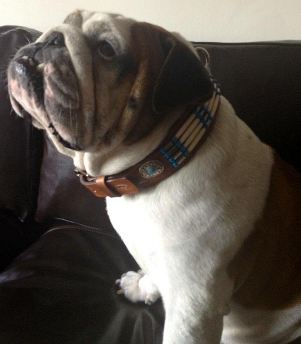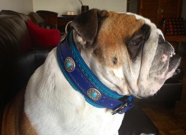 La maitresse d’Edward lui a offert Deux colliers! Il est trés gaté! il porte le collier » Indien » marron clair réf: 0057, ainsi que le collier « Méxicain » réf: 0068 couleur turquoise, avec bande de cuir intérieur bleu marine.