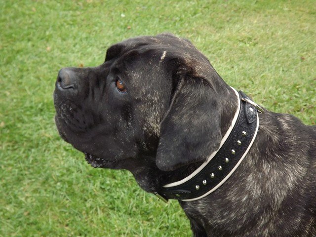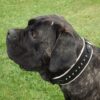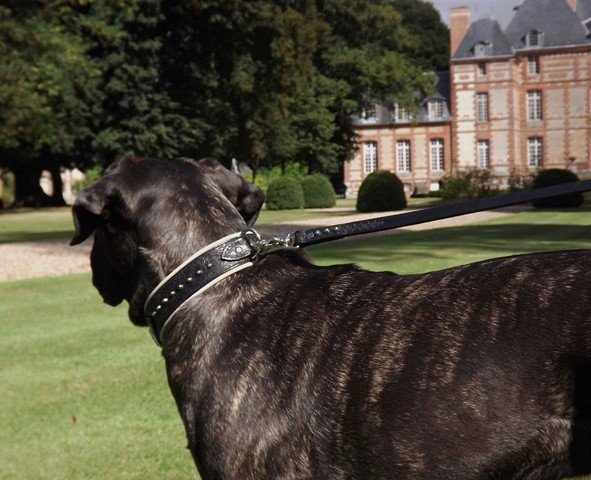 | Fidji porte trés fiérement le collier en cuir » bandana » , avec petits clous nickelés et une doublure en agneau beige ( réf: 1036 ) . Il posséde également la laisse assortie. |
