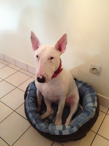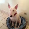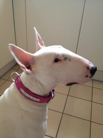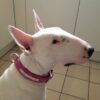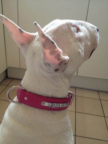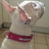 | Magnifique Bull Terrier, Genny porte un collier sur mesure en taurillon rose avec son nom en « lettres strass » |