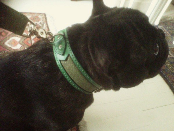 Glen More porte le collier réf 0096 en cuir et galuchat vert.