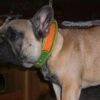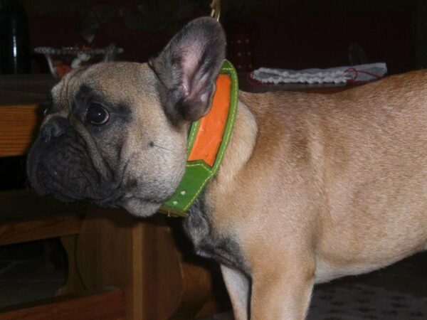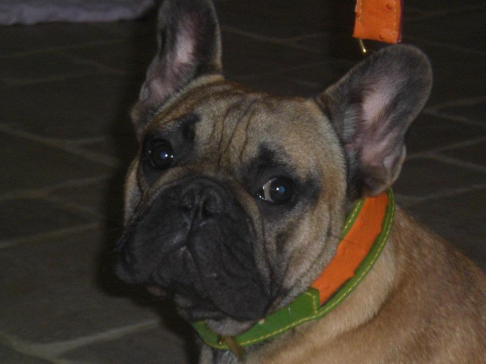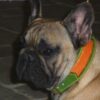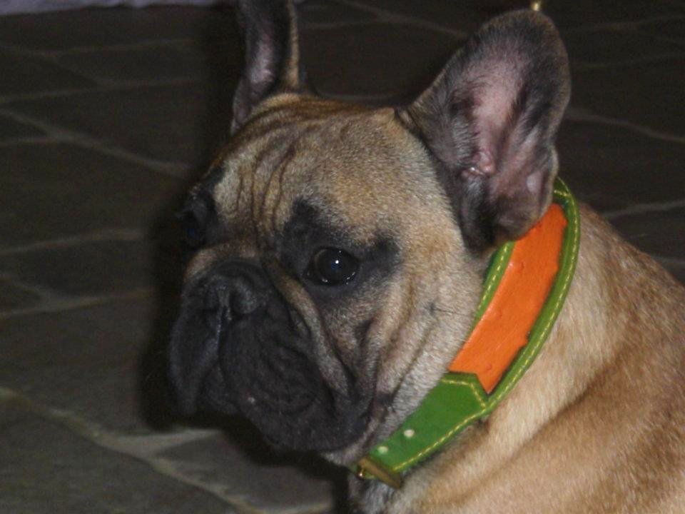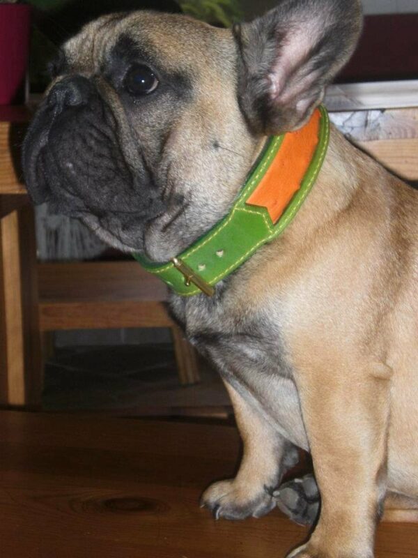 | Gotcha porte un collier cuir vert anis et cuir peau d’autruche orange. |