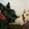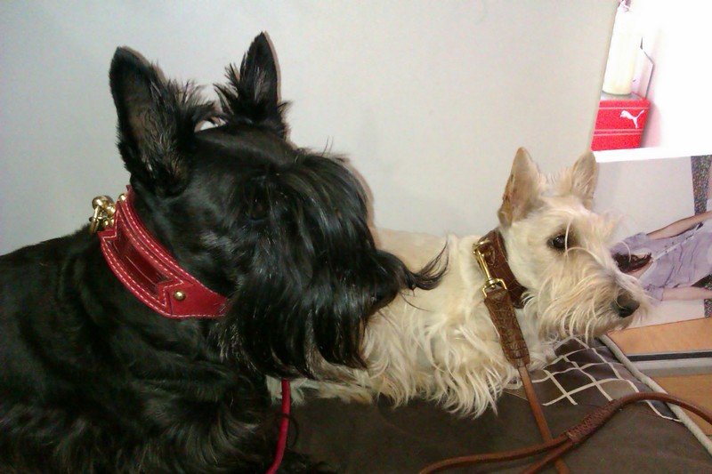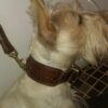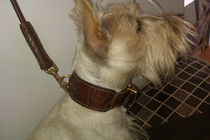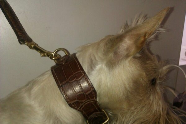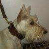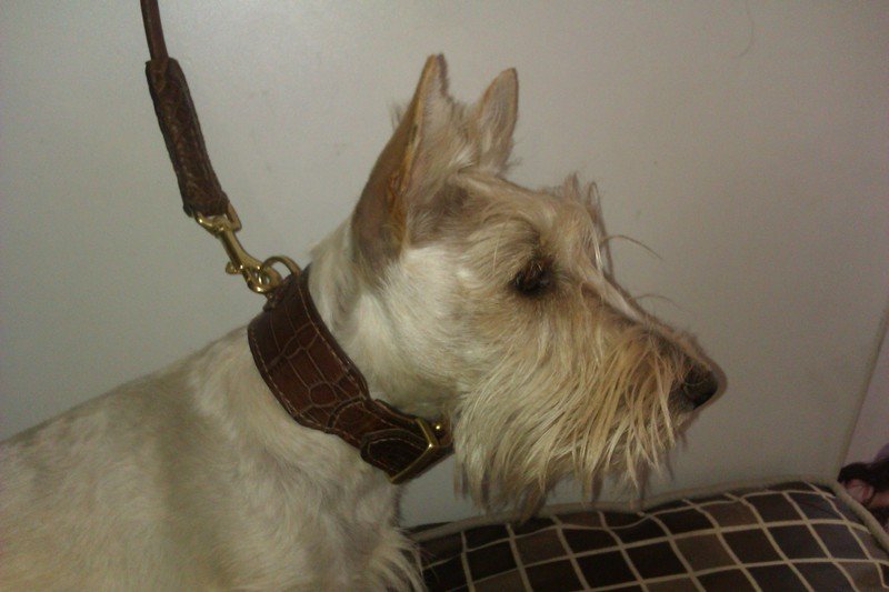 | Griotte est une femelle scottish terrier froment de 1 ans qui porte un collier en croco marron claire et sa laisse assortie ronde. |
