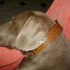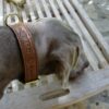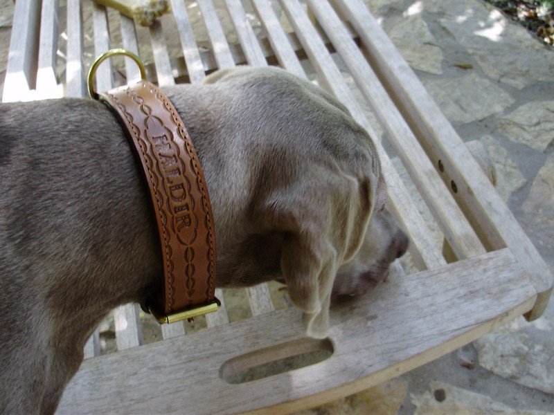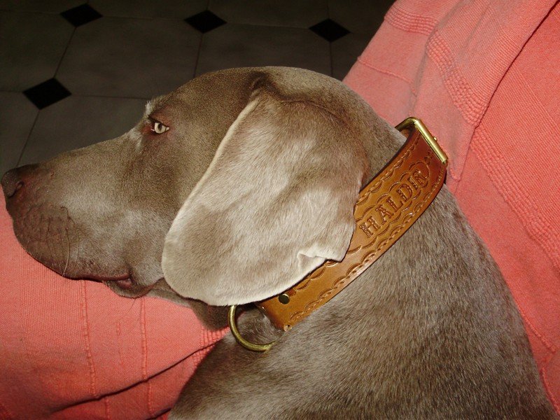 | Haldir est un braque de Weimar, il porte un collier personnalisé. Son nom est martelé à la main entouré de décors martelés. |