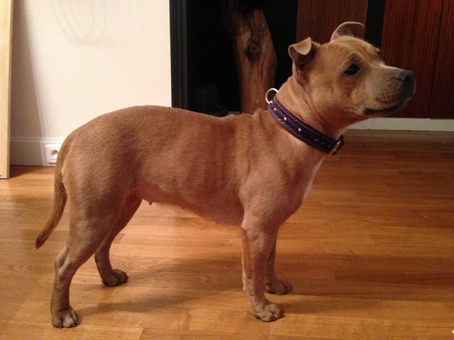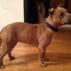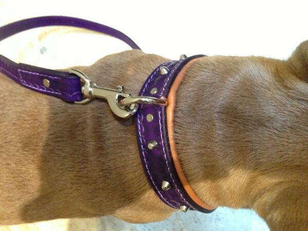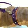 Havane porte un collier en cuir martelé de couleur violette. La doublure est en agneau marron clair. les petits clous et la bouclerie nickelé.