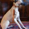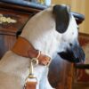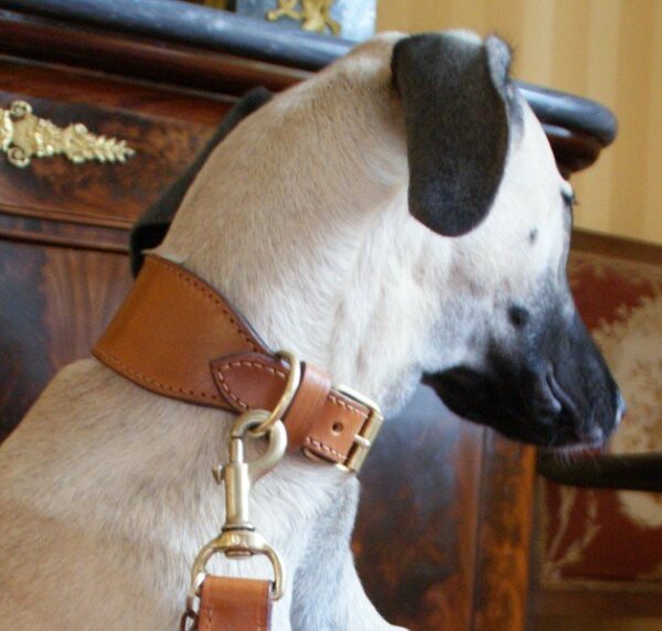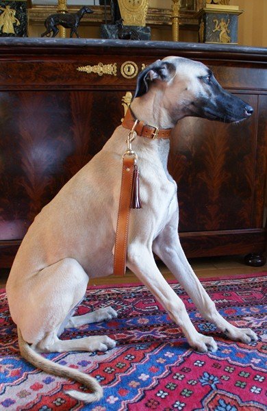 | Hoggar de la Bérondière, lévrier Sloughi porte un ensemble collier et laisse poignet réalisé sur mesure en cuir de sellerie, doublure agneau. |