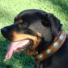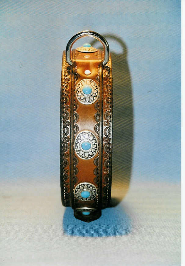 Elle porte un collier en cuir « mexicain » avec décors martelés