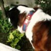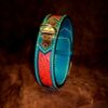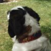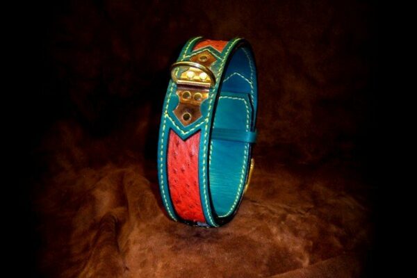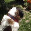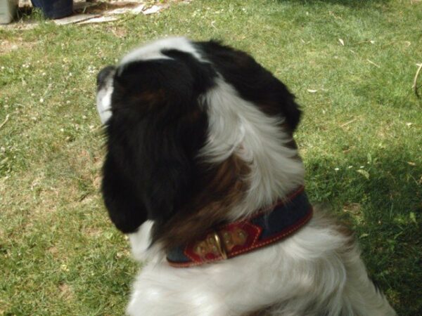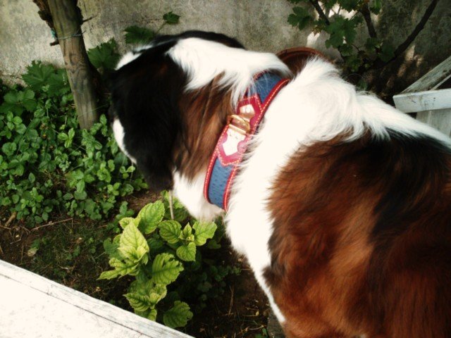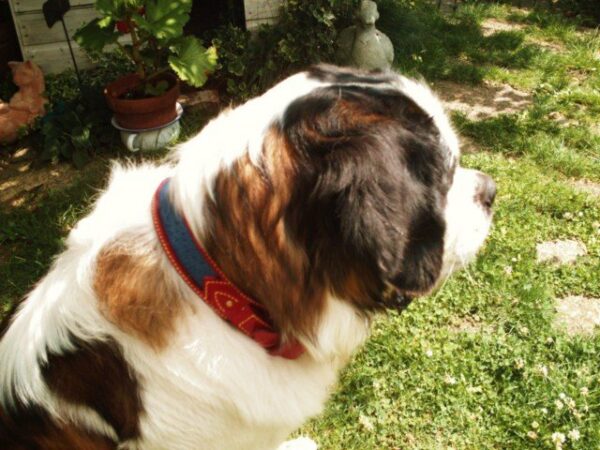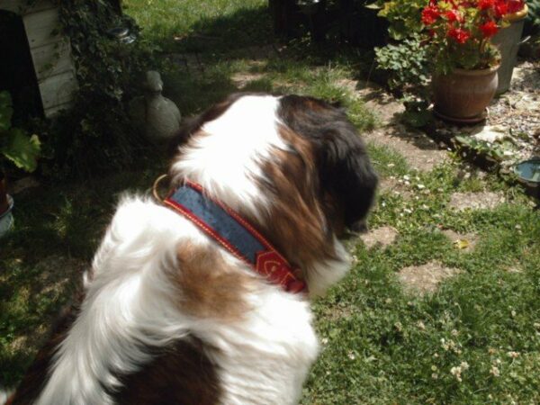 | Voici une saint Bernard joliment habillée!! Son collier est en cuir rouge et la peau d’autruche bleu. |